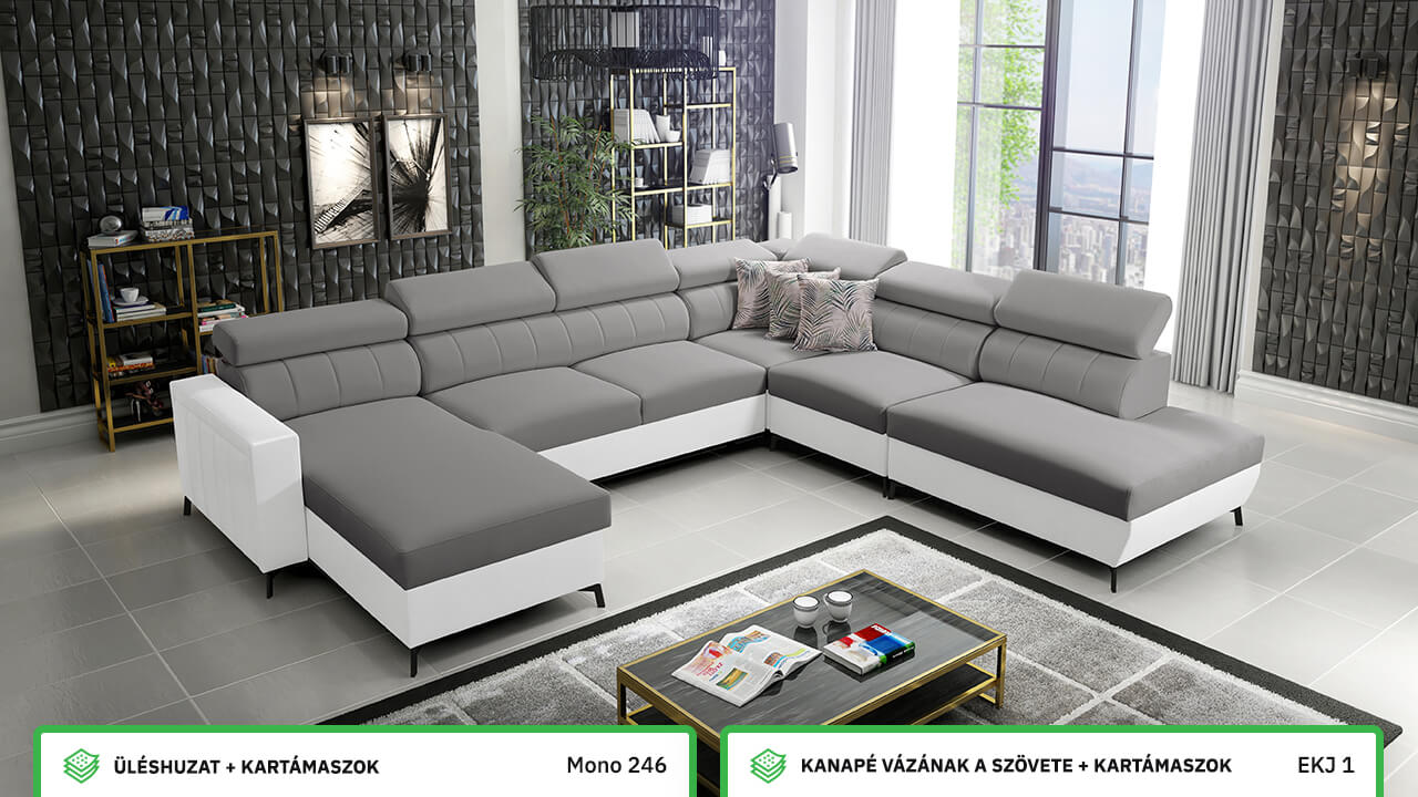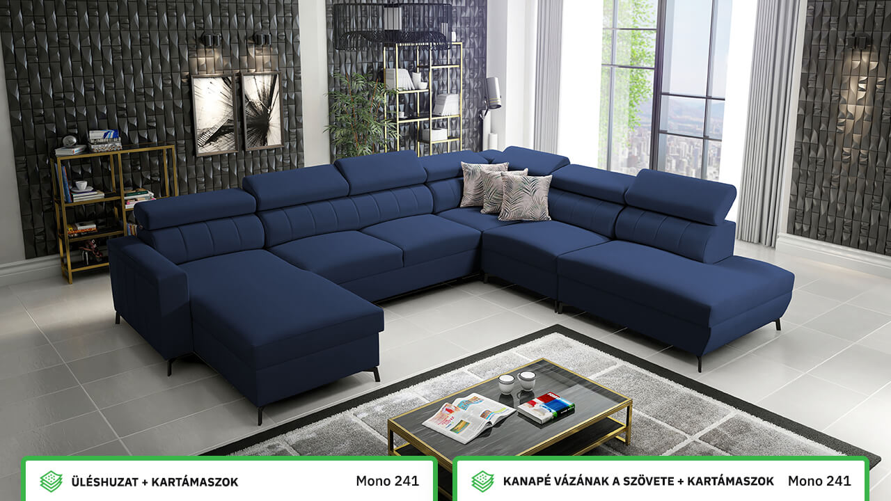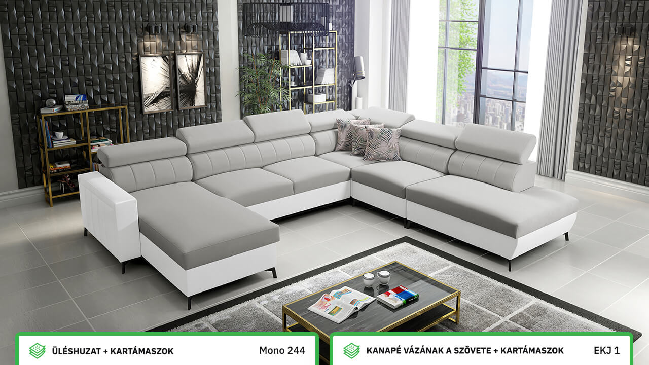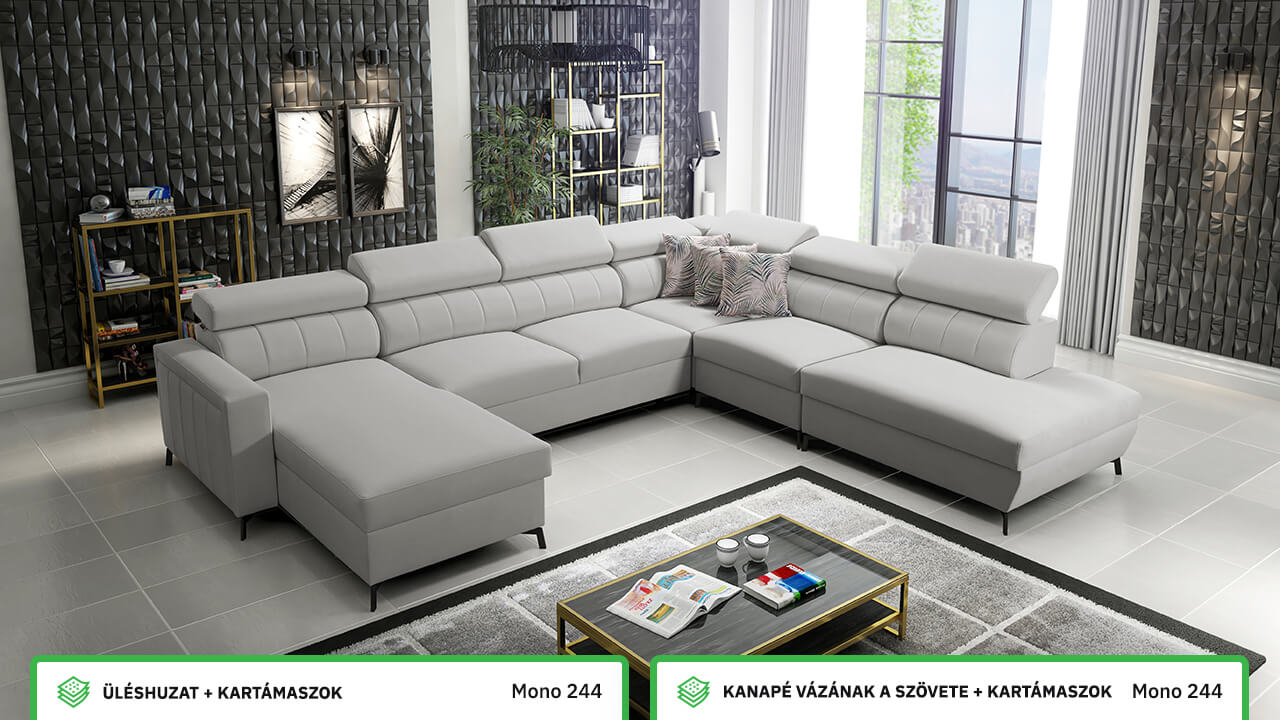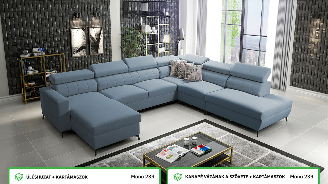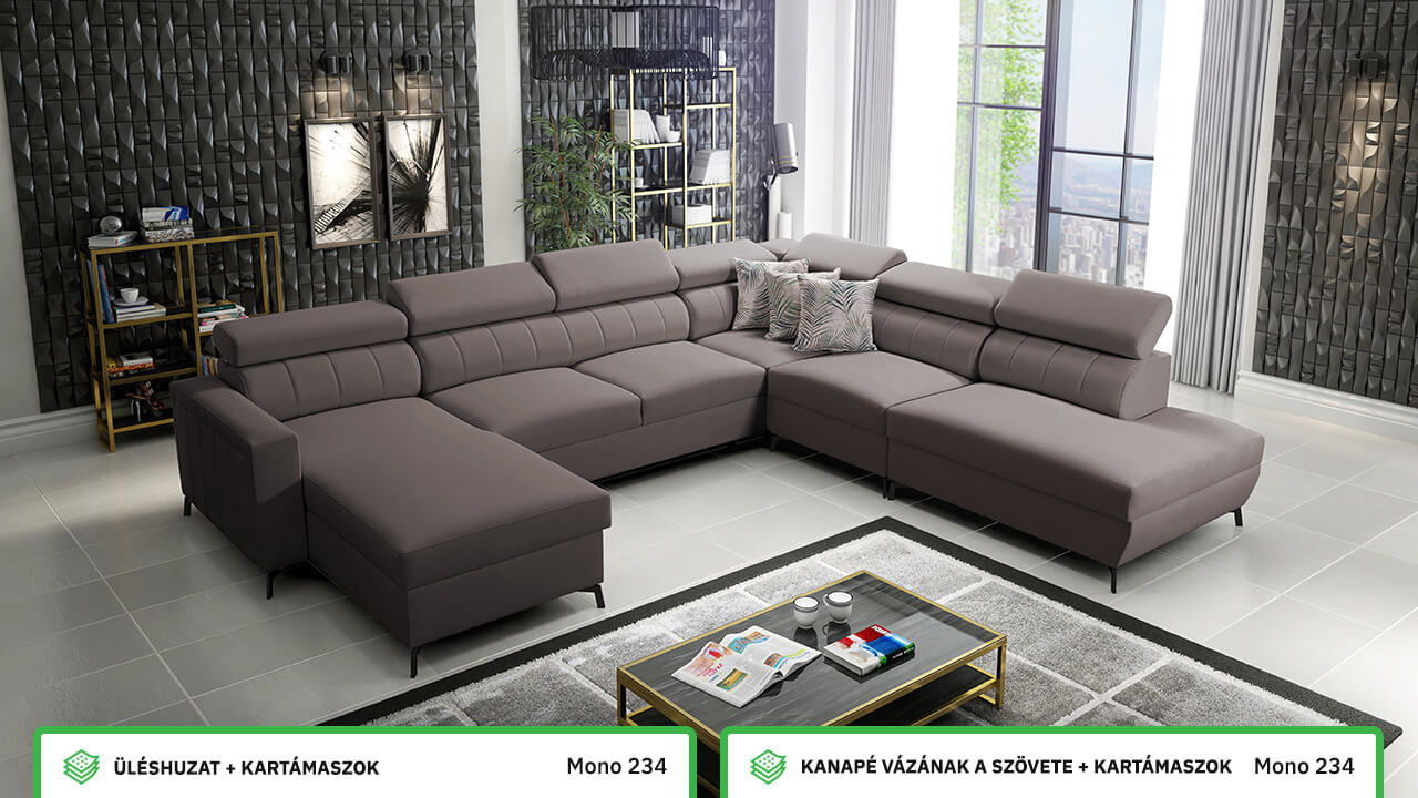 Egy nagy U alakú kanapé, amelyen kényelmesen elfér az egész család vagy egy nagyobb vendégsereg. Szilárd konstrukcióból készült, így nagyobb súlyokat és gyakori használatot is elbír. Az állítható fejtámlák és a kényelmes ülések növelik a tökéletes kényelmet. Örülni fog az igazán nagy, akár három különálló részre osztott tárolóhelynek is.