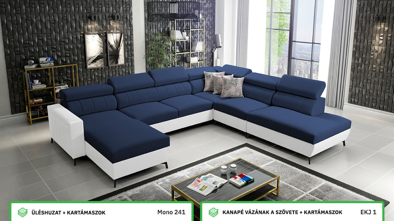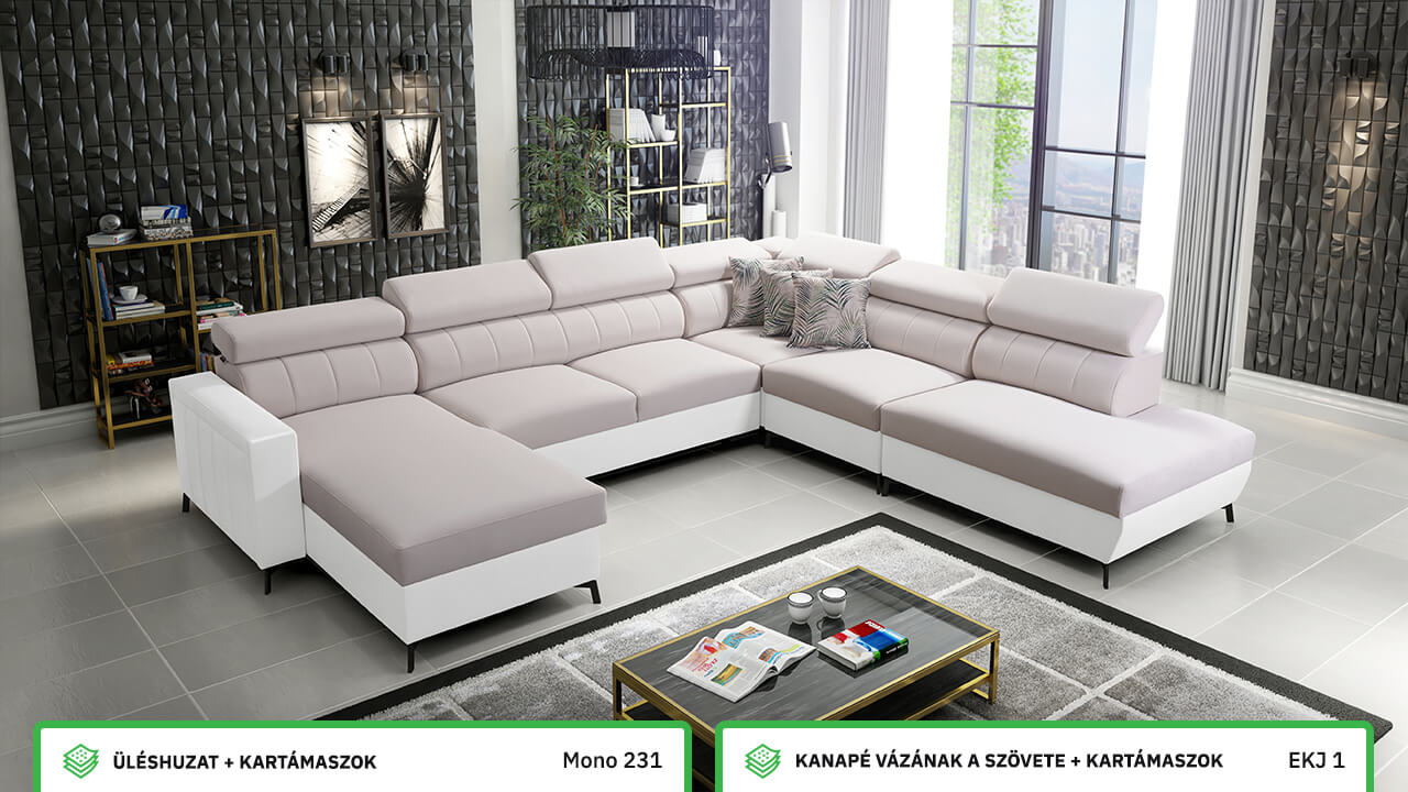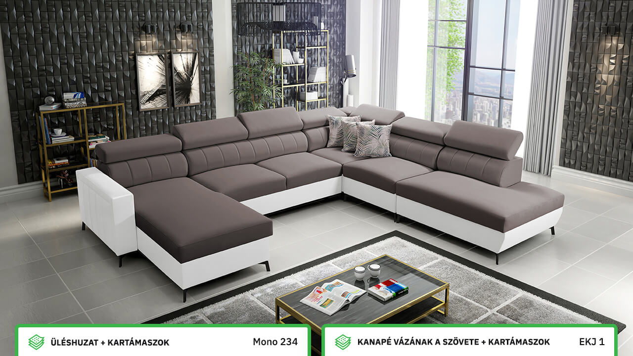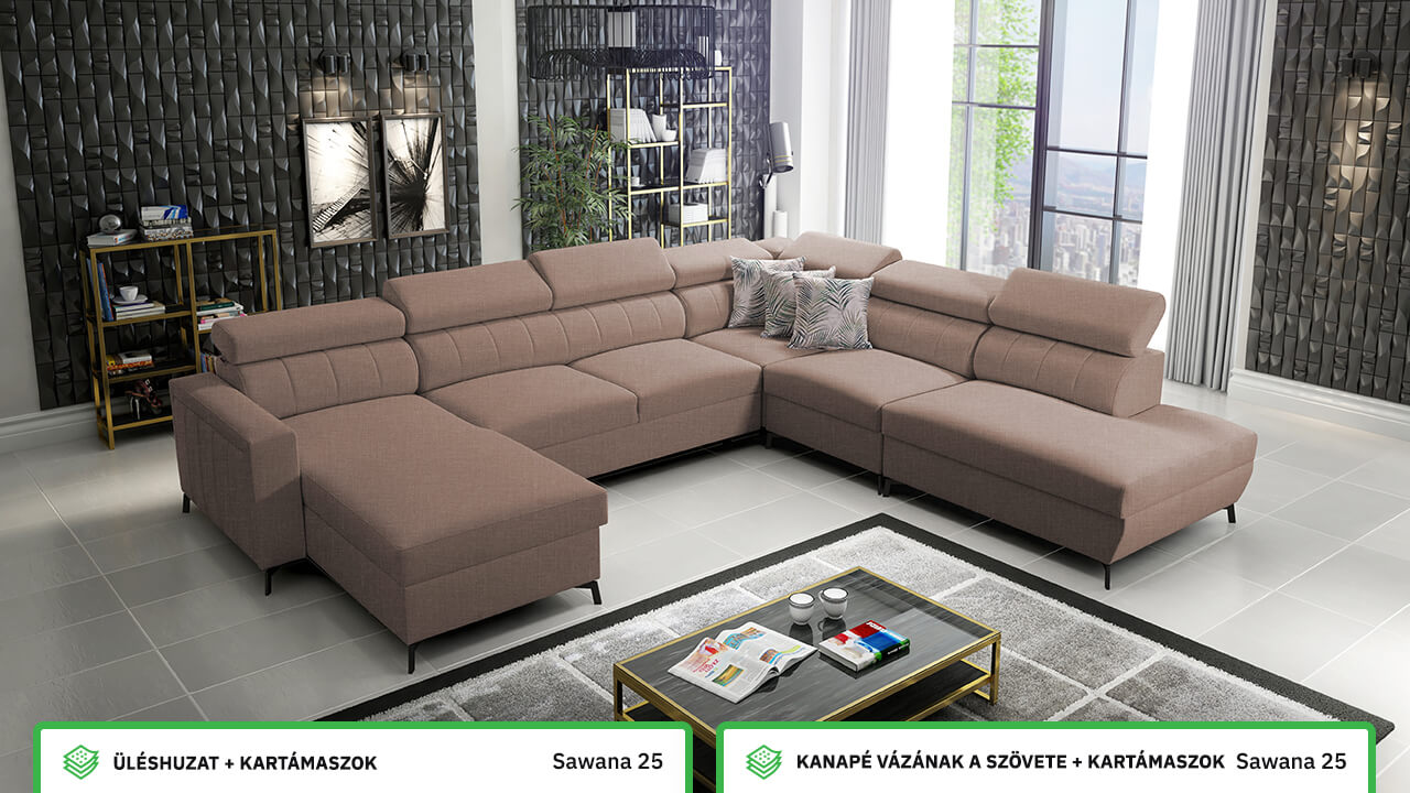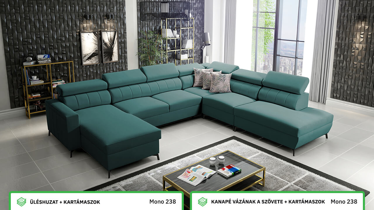 Egy nagy U alakú kanapé, amelyen kényelmesen elfér az egész család vagy egy nagyobb vendégsereg. Szilárd konstrukcióból készült, így nagyobb súlyokat és gyakori használatot is elbír. Az állítható fejtámlák és a kényelmes ülések növelik a tökéletes kényelmet. Örülni fog az igazán nagy, akár három különálló részre osztott tárolóhelynek is.
