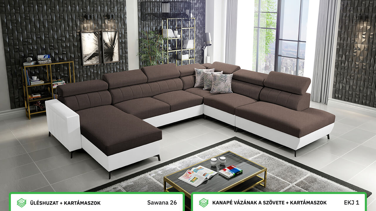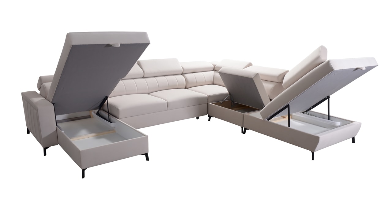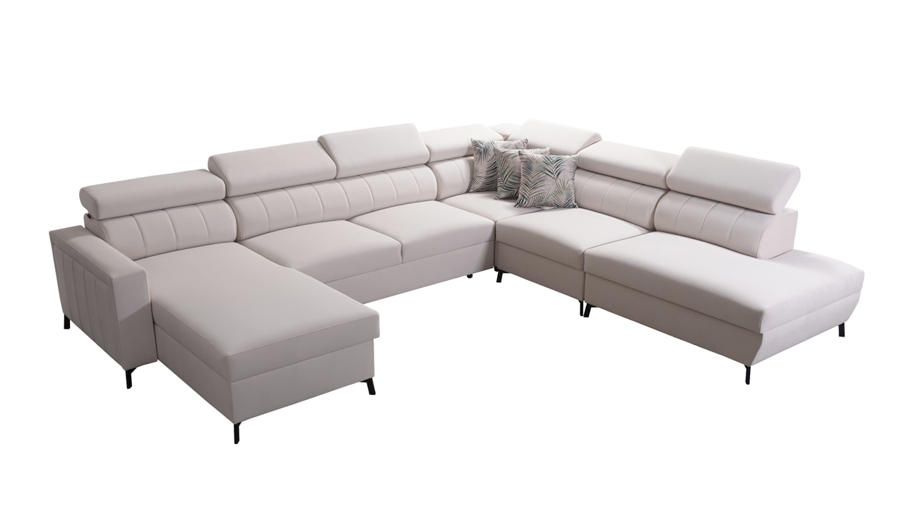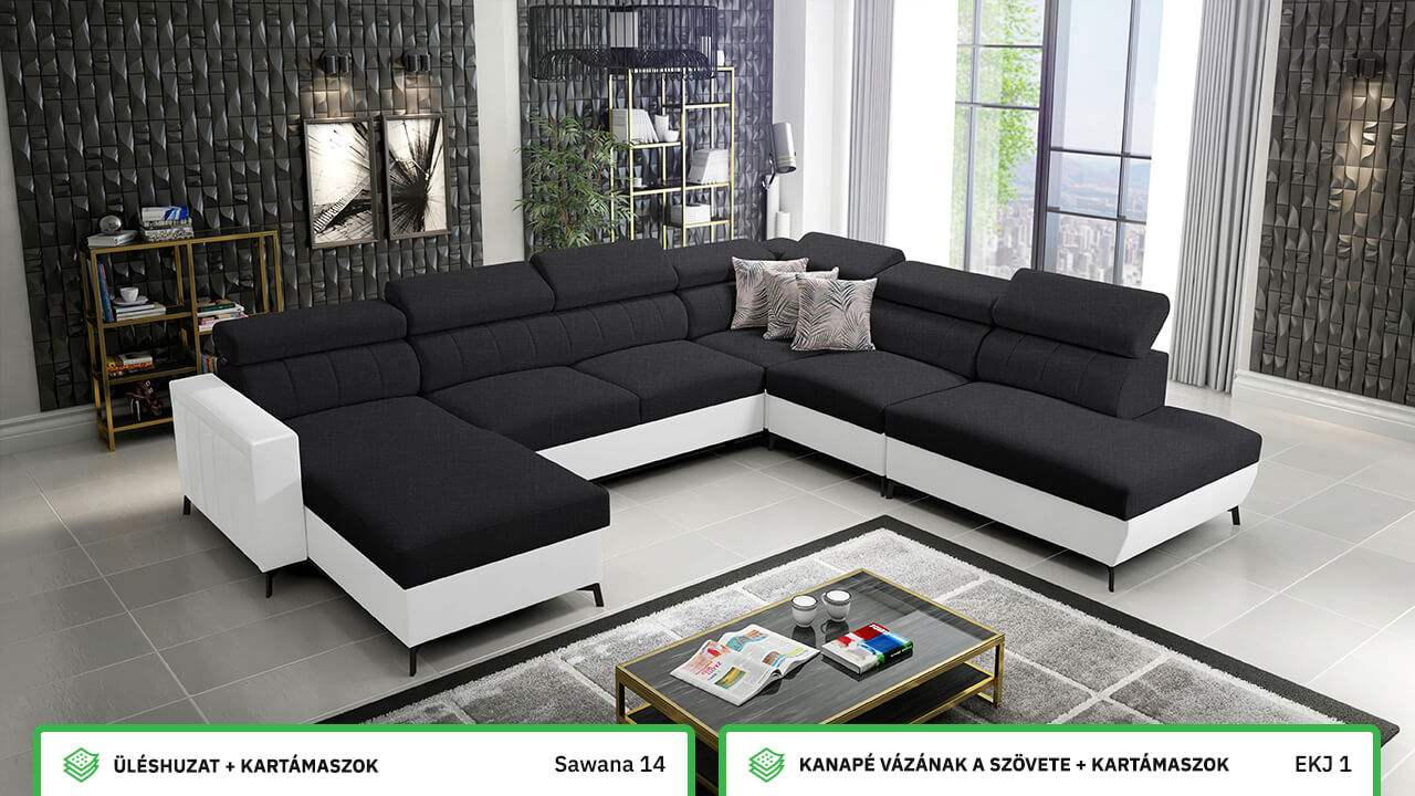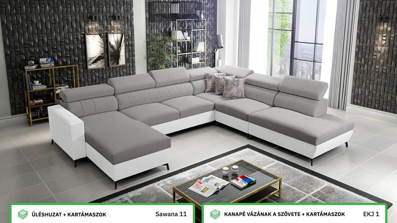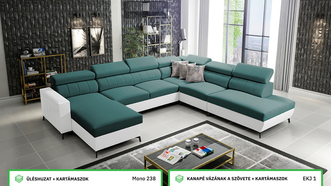 Egy nagy U alakú kanapé, amelyen kényelmesen elfér az egész család vagy egy nagyobb vendégsereg. Szilárd konstrukcióból készült, így nagyobb súlyokat és gyakori használatot is elbír. Az állítható fejtámlák és a kényelmes ülések növelik a tökéletes kényelmet. Örülni fog az igazán nagy, akár három különálló részre osztott tárolóhelynek is.