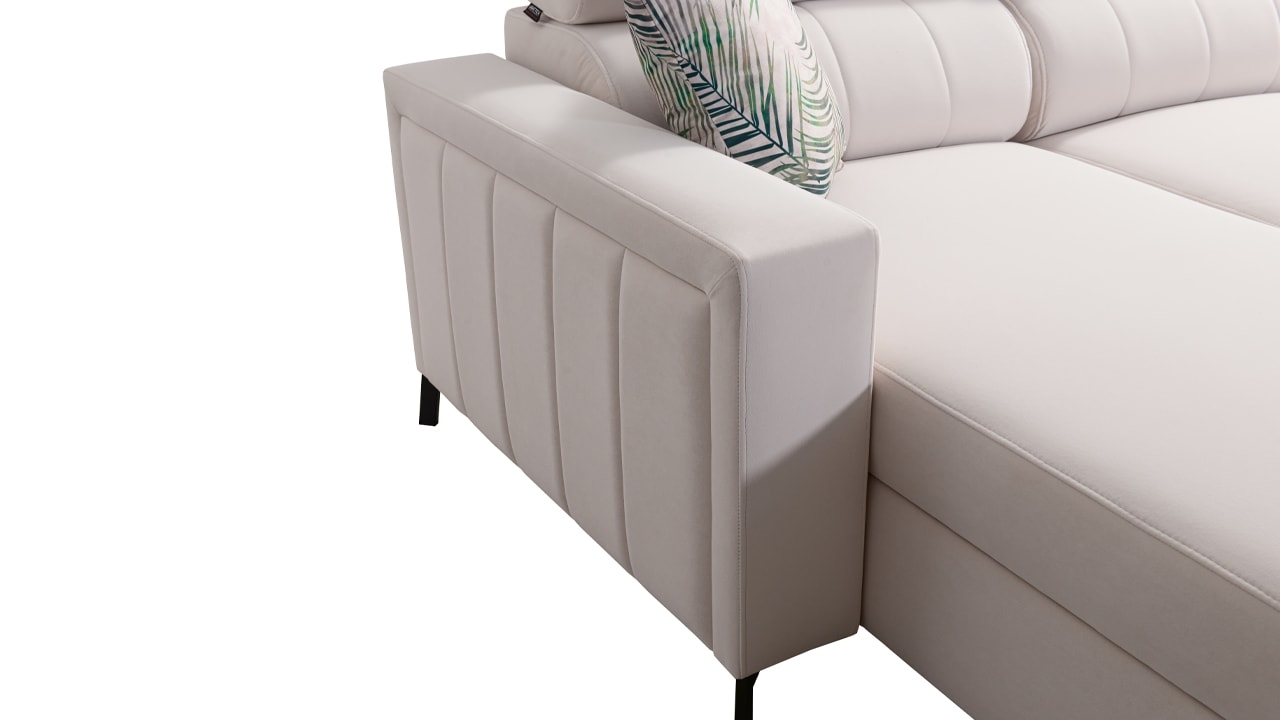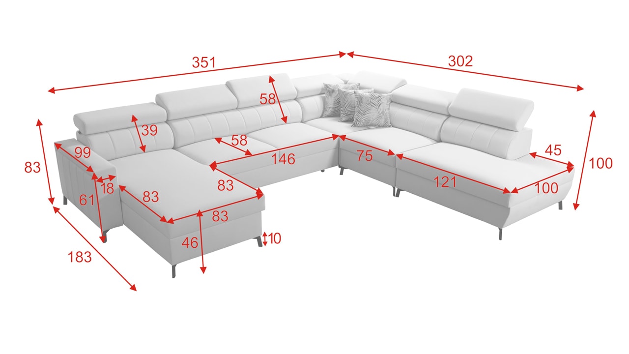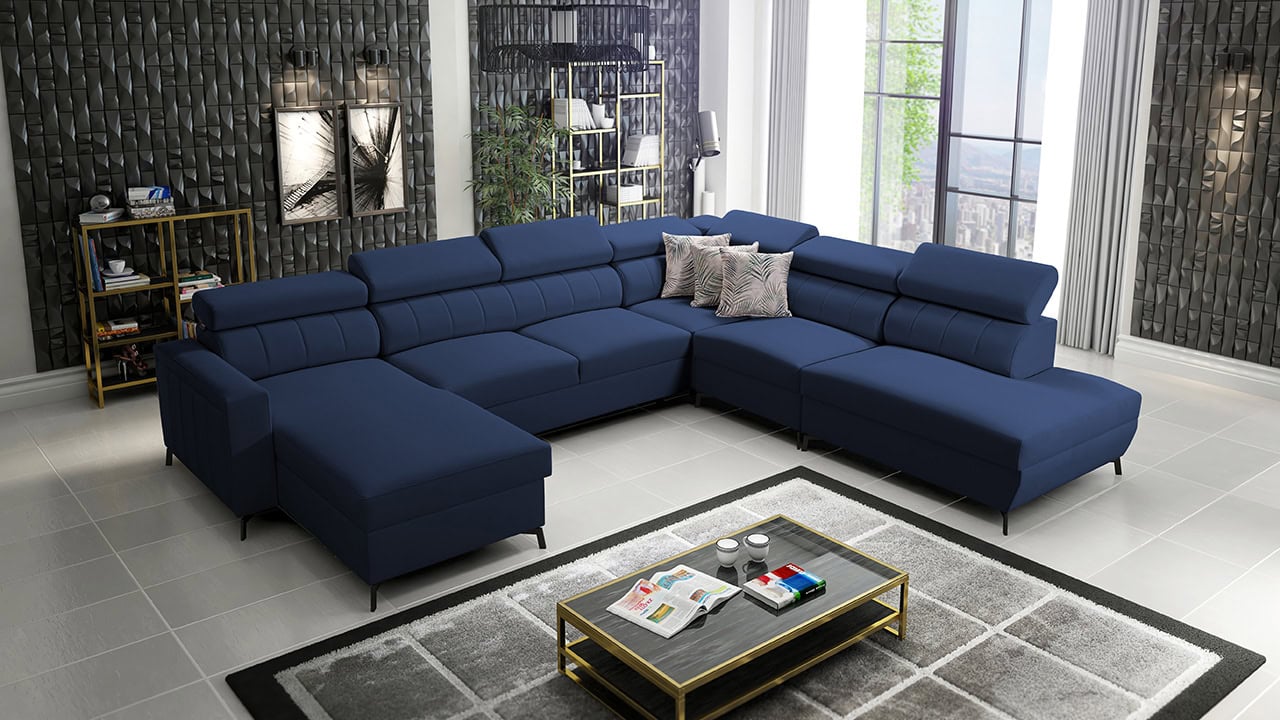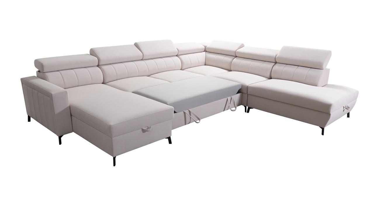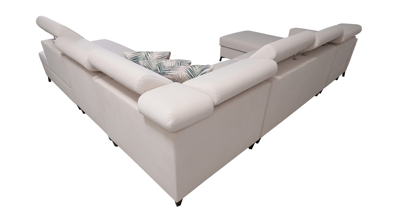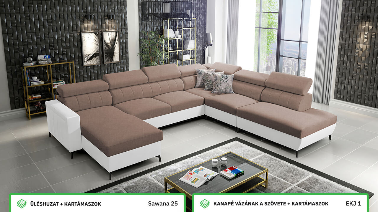 Egy nagy U alakú kanapé, amelyen kényelmesen elfér az egész család vagy egy nagyobb vendégsereg. Szilárd konstrukcióból készült, így nagyobb súlyokat és gyakori használatot is elbír. Az állítható fejtámlák és a kényelmes ülések növelik a tökéletes kényelmet. Örülni fog az igazán nagy, akár három különálló részre osztott tárolóhelynek is.