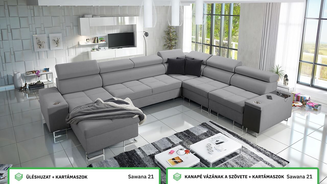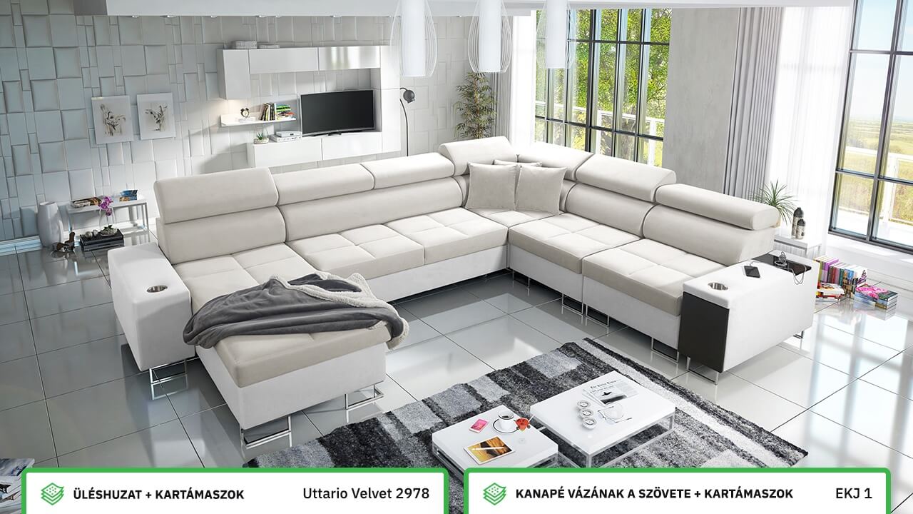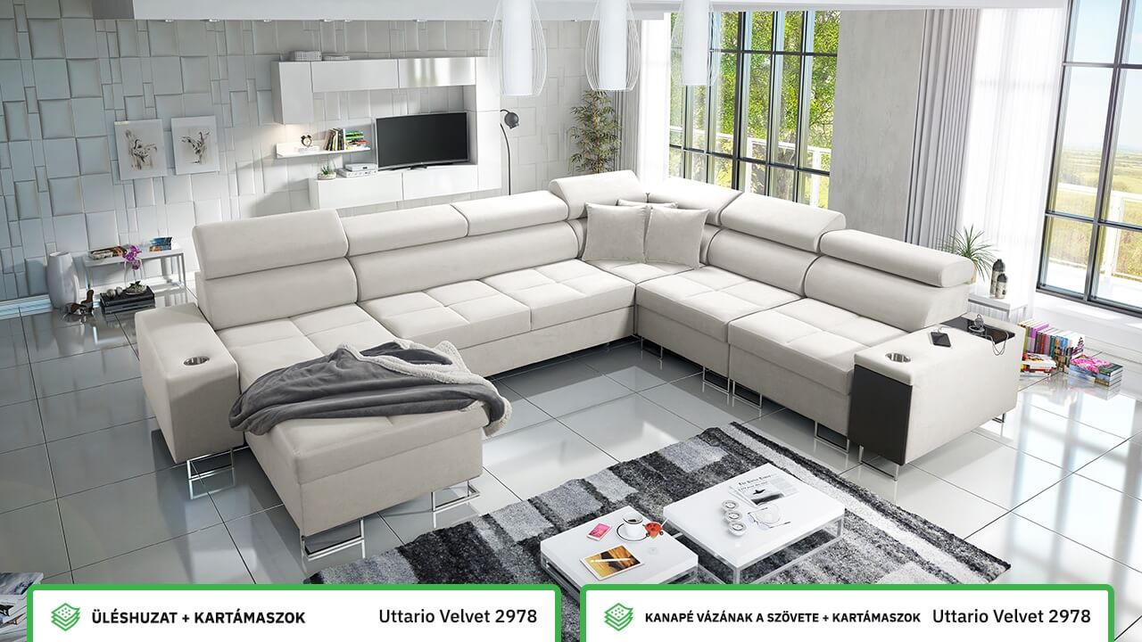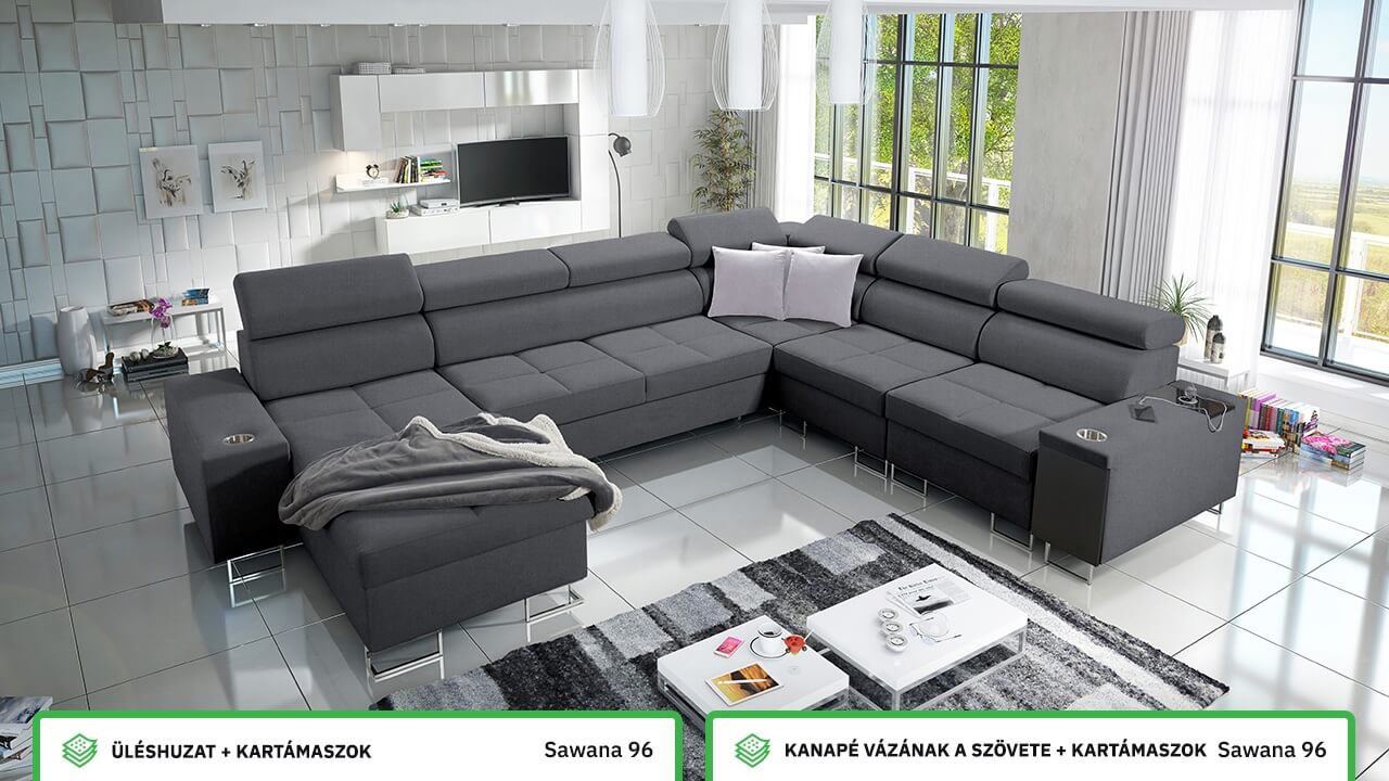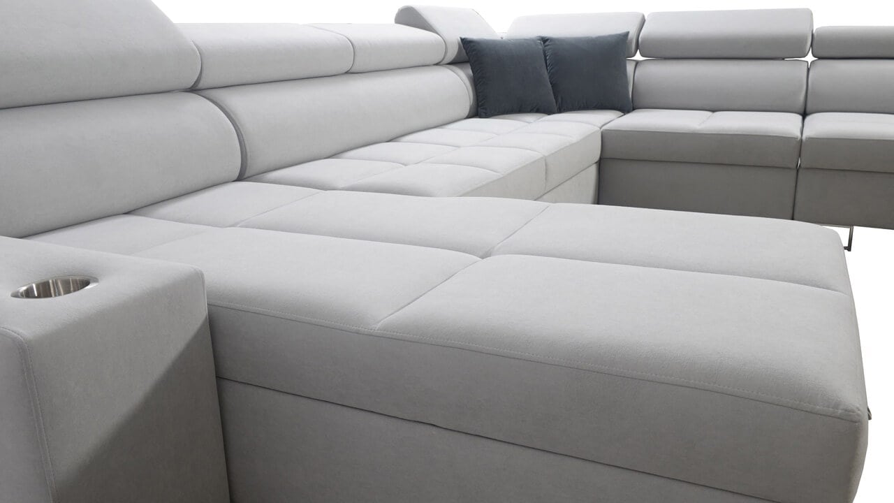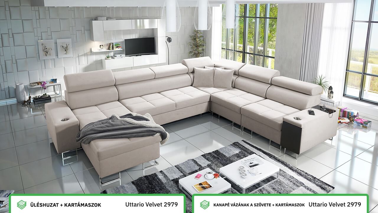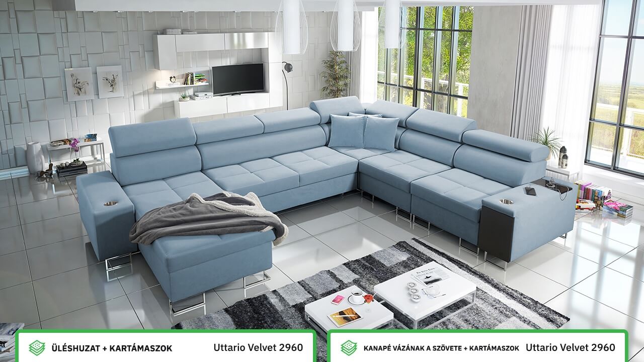 Ezen az igazán tágas U alakú kanapén kényelmesen elfér az egész család vagy egy nagyobb vendégség. Minőségi konstrukciója nagyobb súlyokat is elbír, és biztosítja, hogy a kanapé még évek múltán se válljon széttülté. Az igazi kényelem érdekében élvezheti az állítható fejtámlákat, a beépített minibárt, a pohártartókat és a beépített töltőállomást.