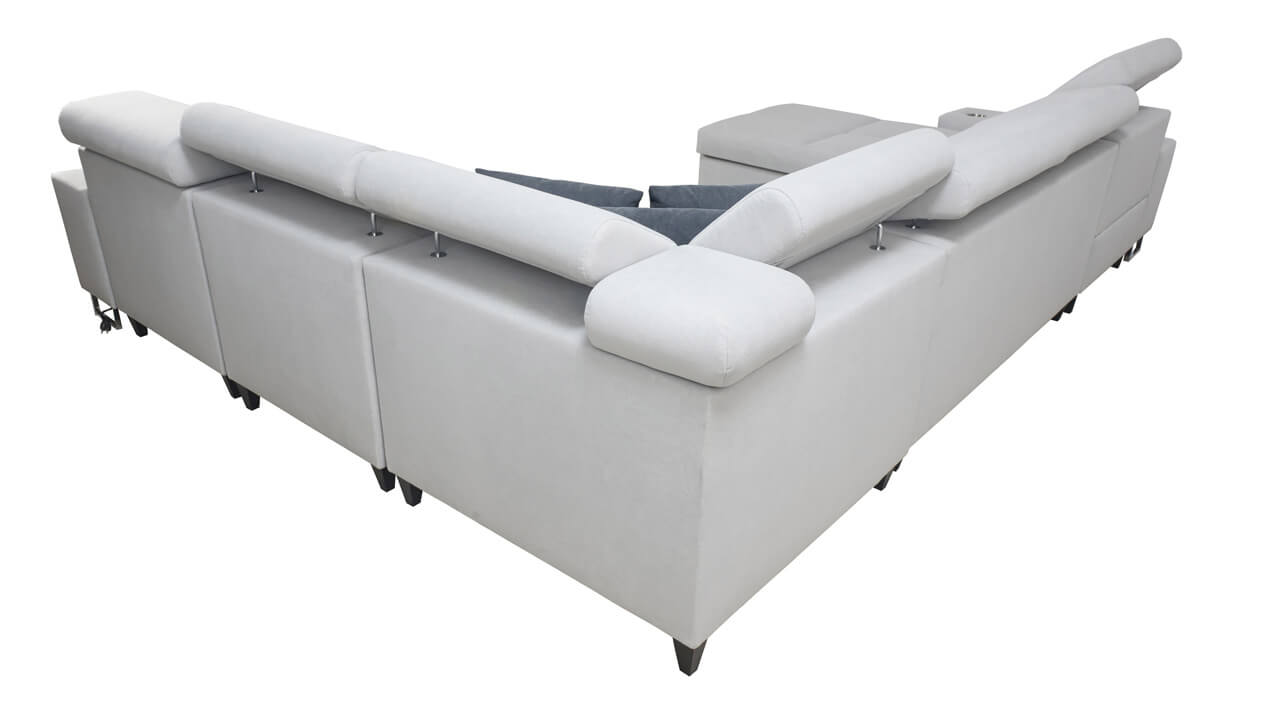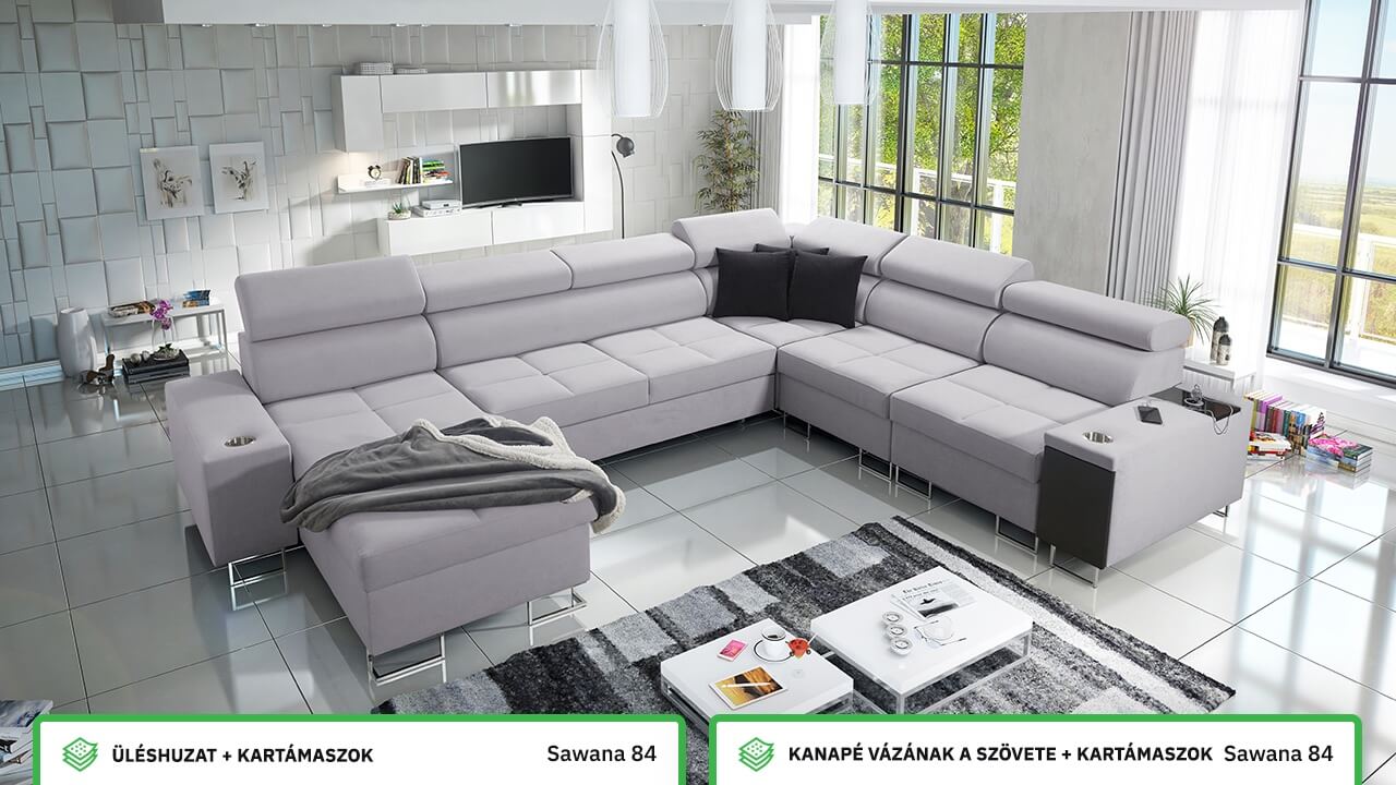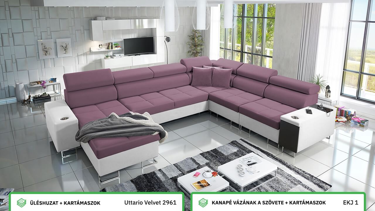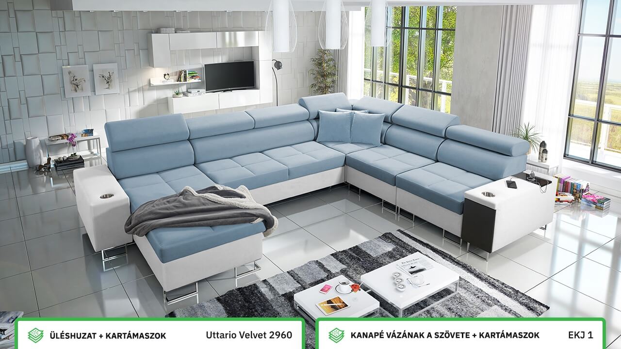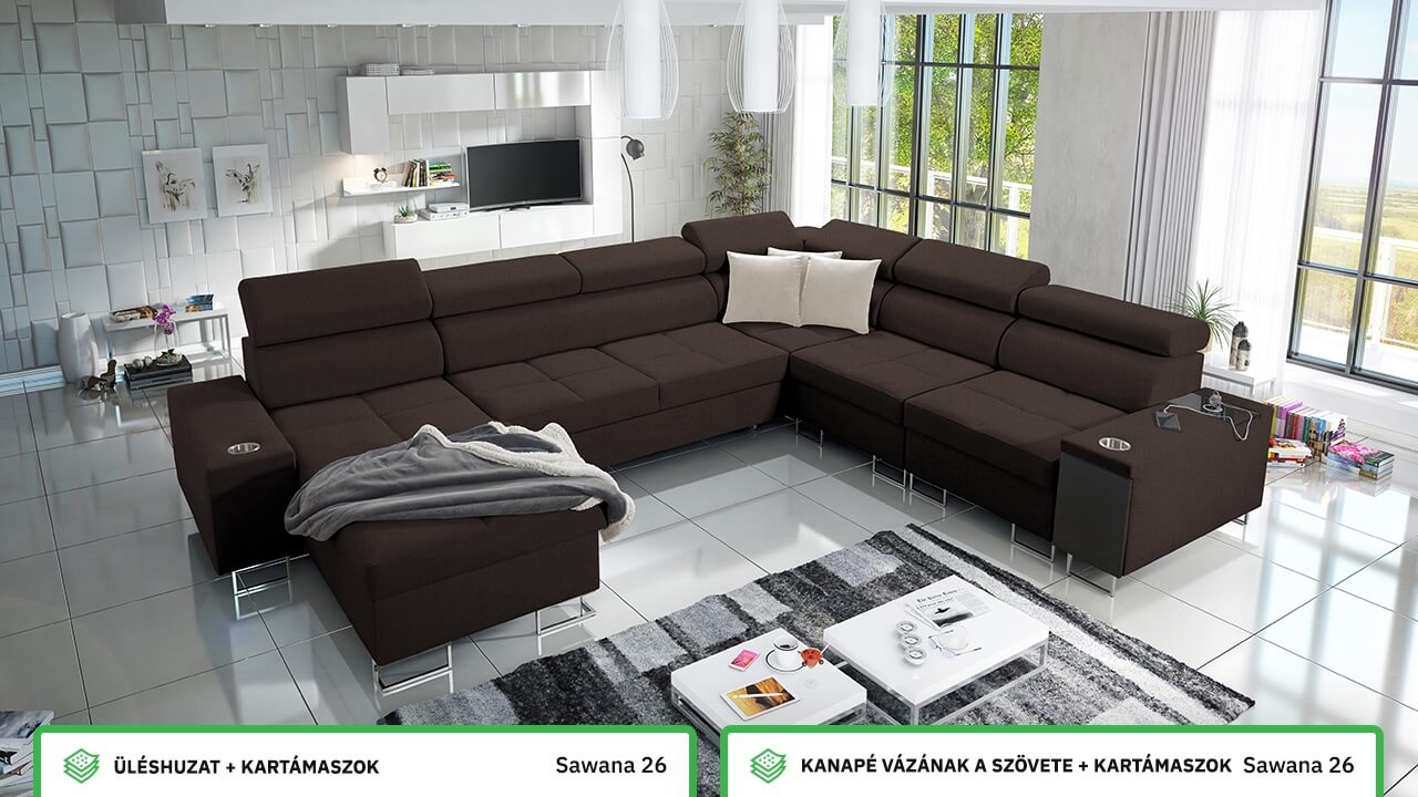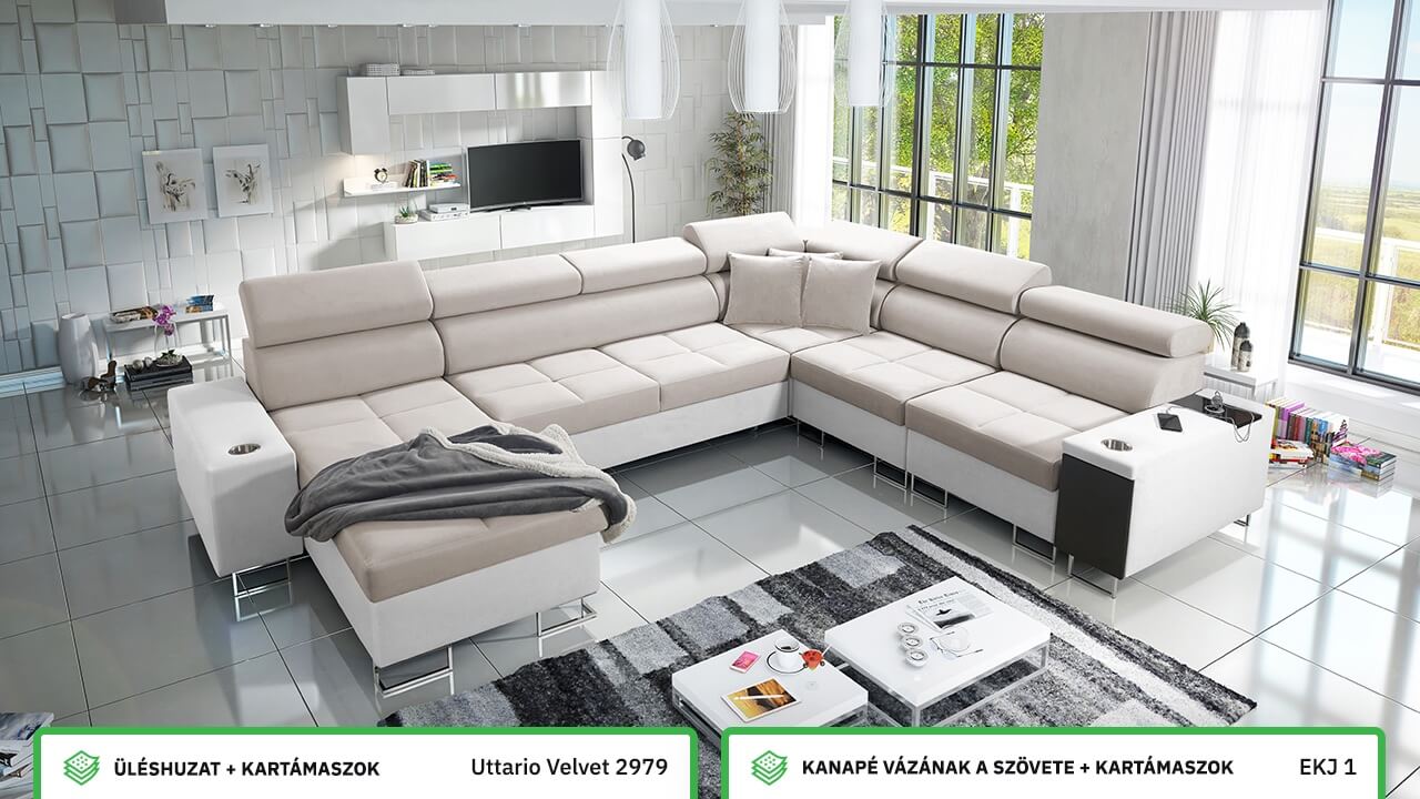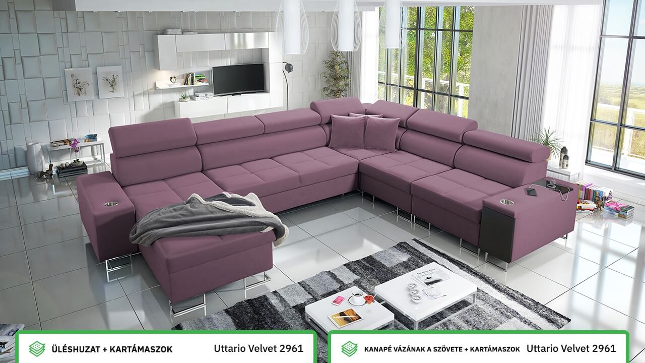 Ezen az igazán tágas U alakú kanapén kényelmesen elfér az egész család vagy egy nagyobb vendégség. Minőségi konstrukciója nagyobb súlyokat is elbír, és biztosítja, hogy a kanapé még évek múltán se válljon széttülté. Az igazi kényelem érdekében élvezheti az állítható fejtámlákat, a beépített minibárt, a pohártartókat és a beépített töltőállomást.