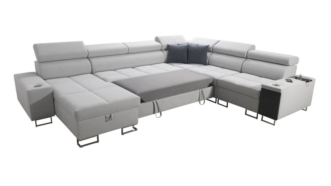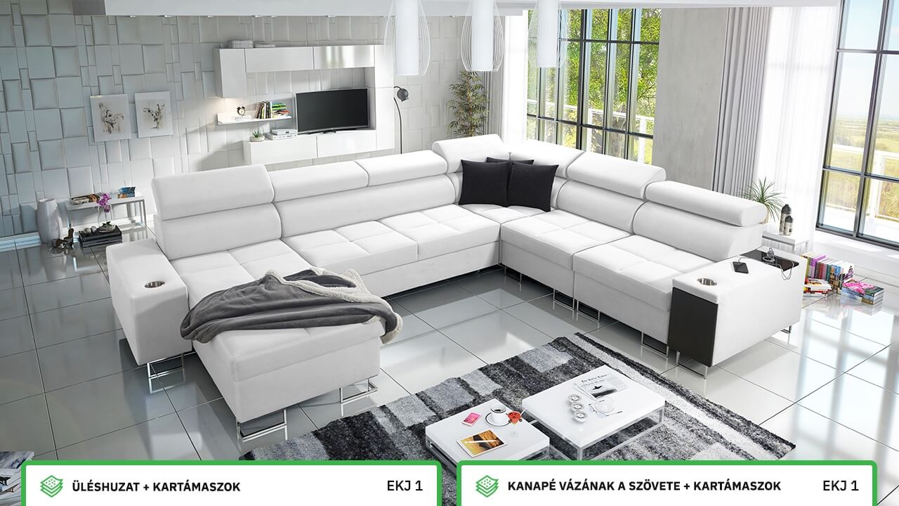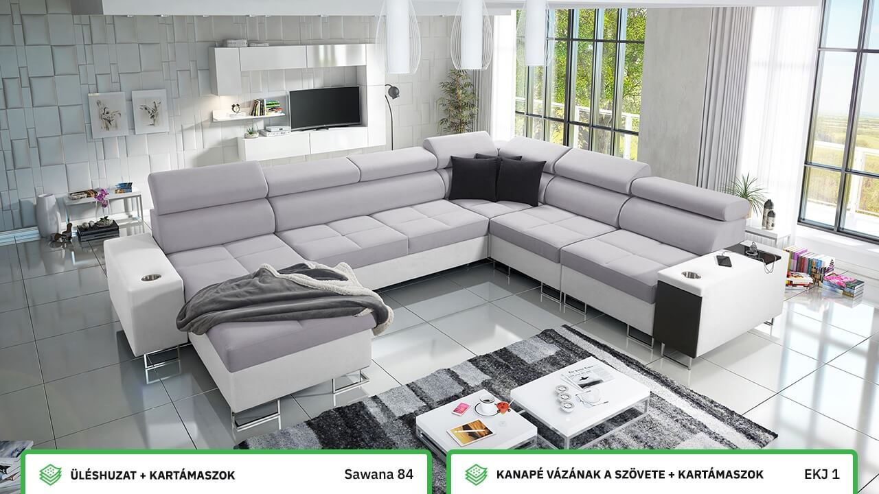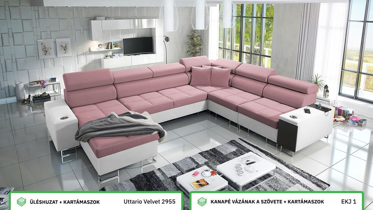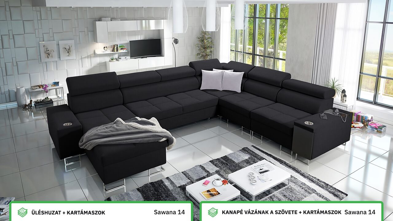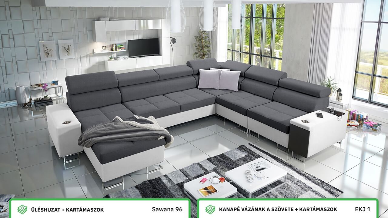 Ezen az igazán tágas U alakú kanapén kényelmesen elfér az egész család vagy egy nagyobb vendégség. Minőségi konstrukciója nagyobb súlyokat is elbír, és biztosítja, hogy a kanapé még évek múltán se válljon széttülté. Az igazi kényelem érdekében élvezheti az állítható fejtámlákat, a beépített minibárt, a pohártartókat és a beépített töltőállomást.
