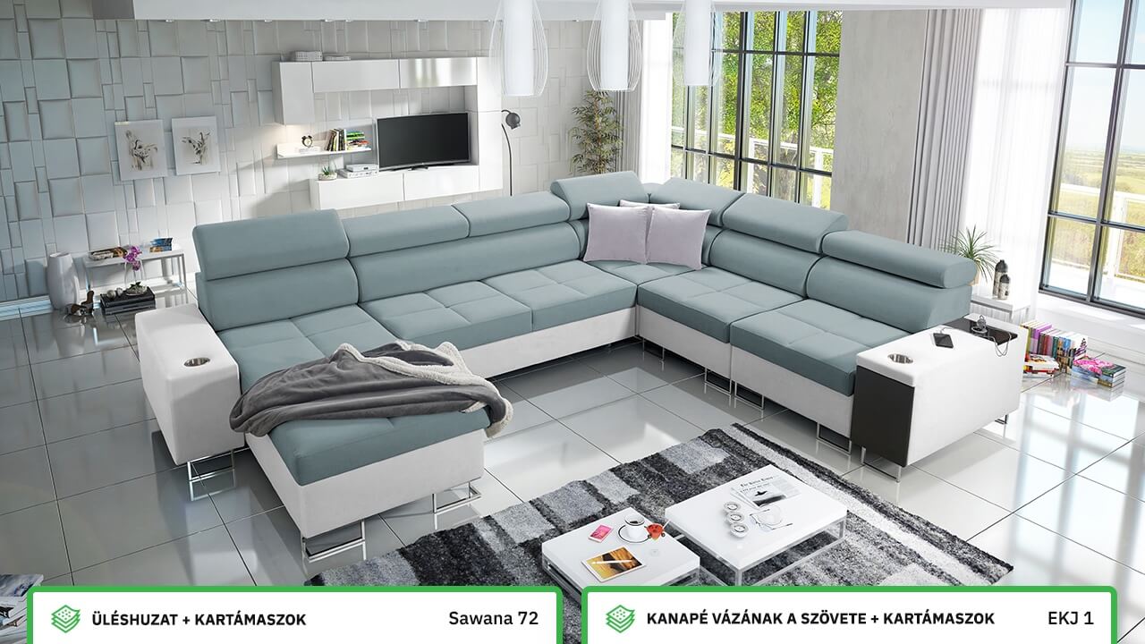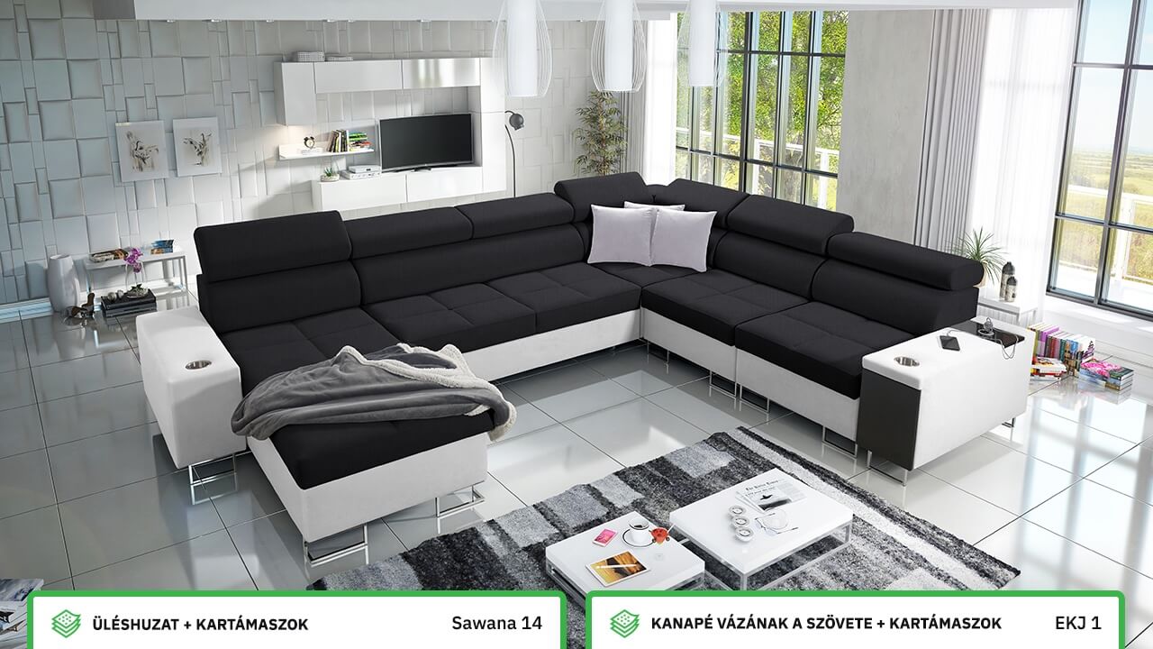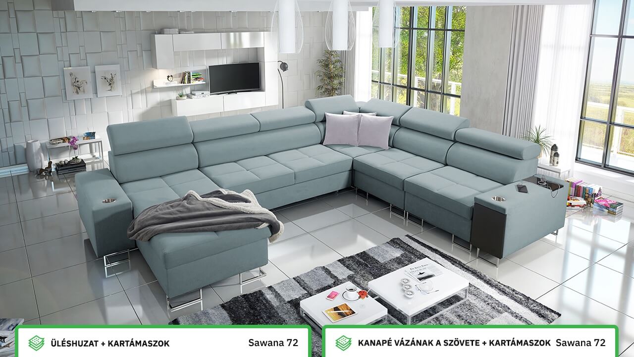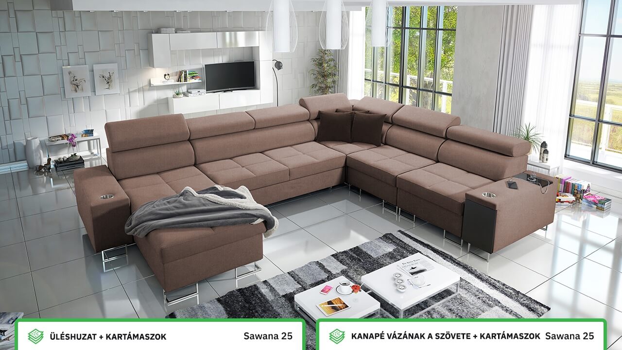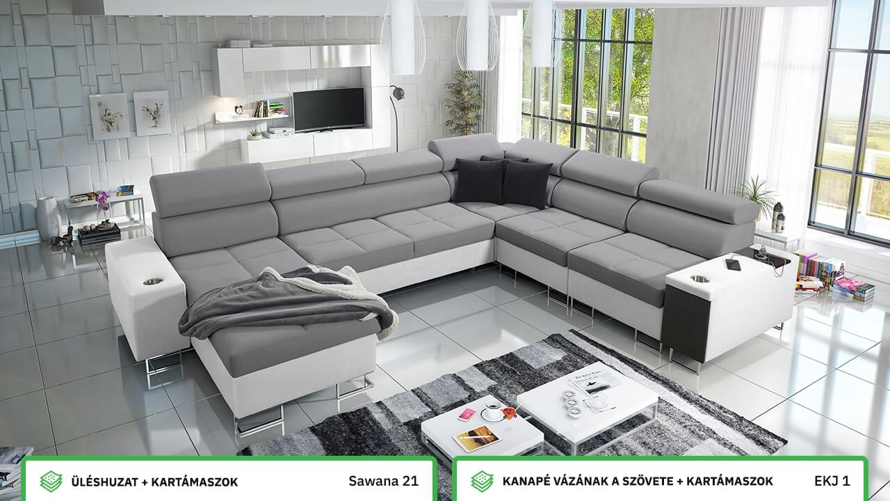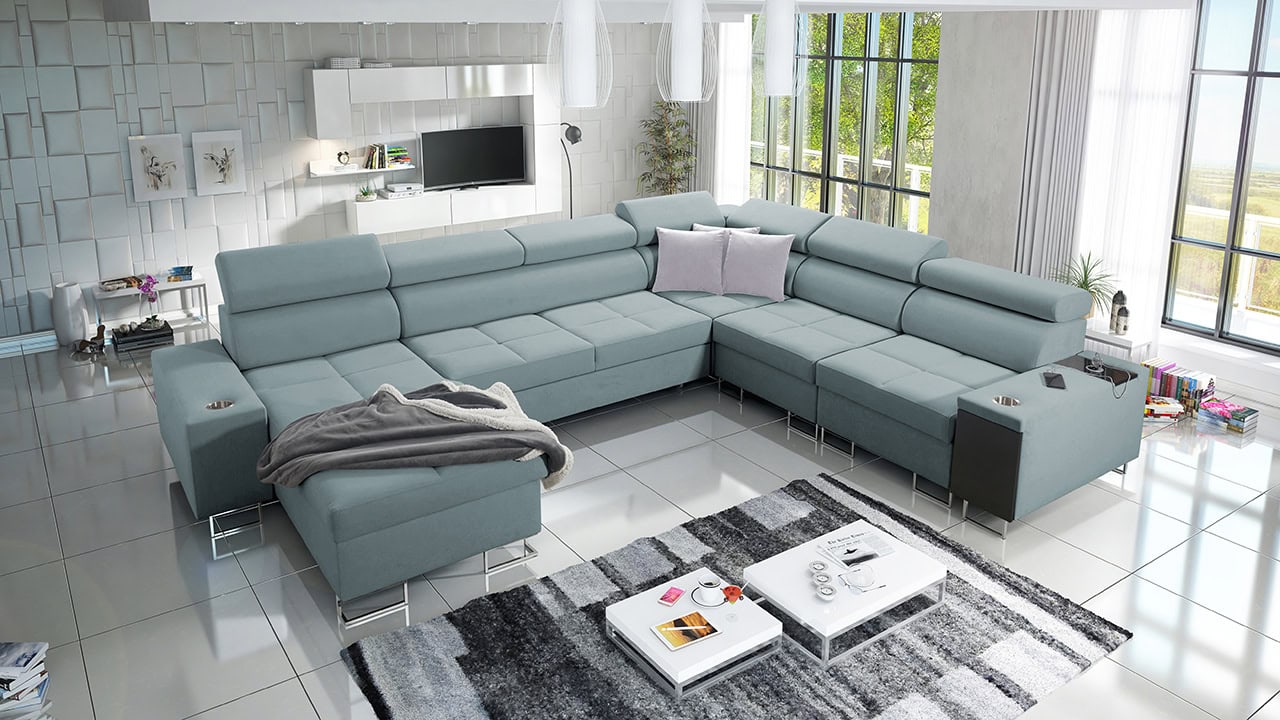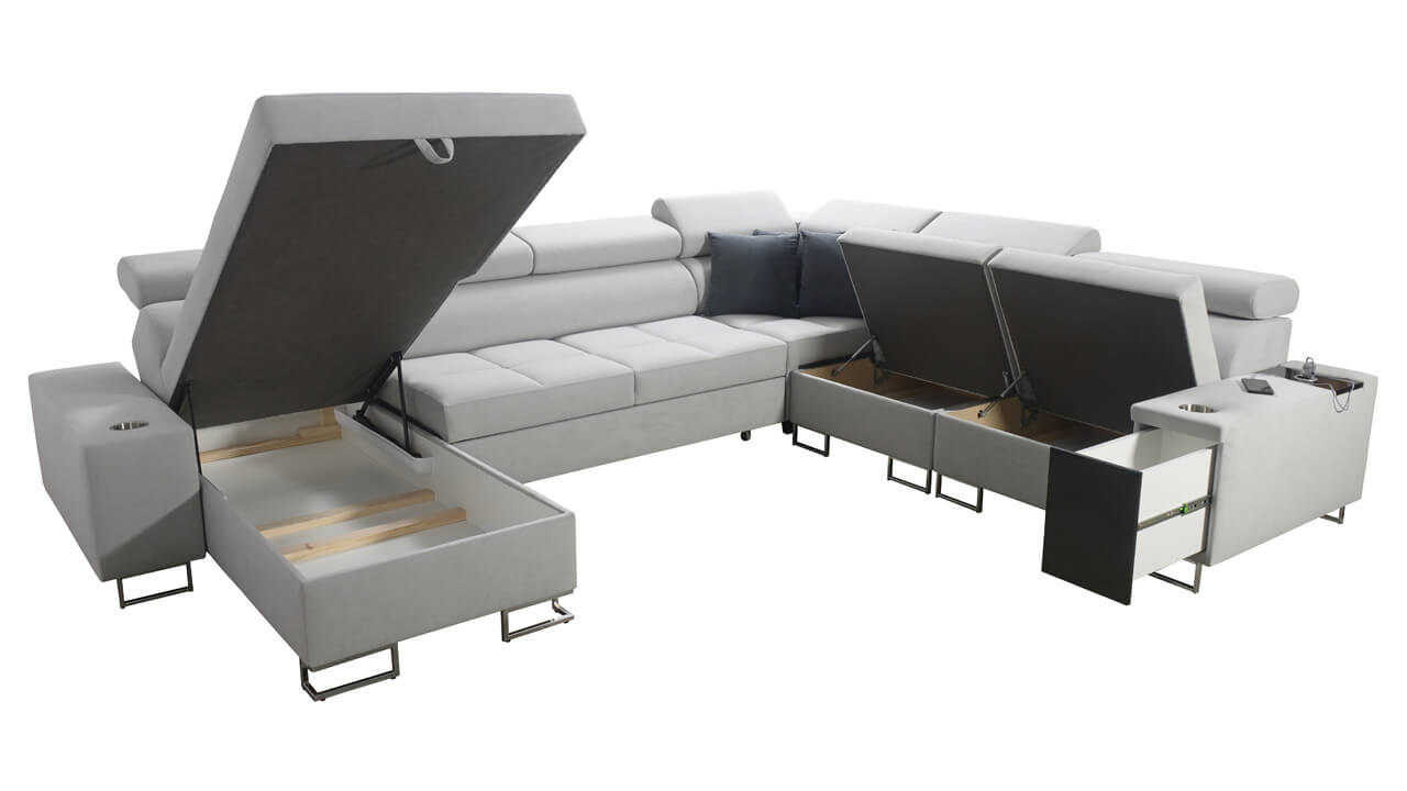 Ezen az igazán tágas U alakú kanapén kényelmesen elfér az egész család vagy egy nagyobb vendégség. Minőségi konstrukciója nagyobb súlyokat is elbír, és biztosítja, hogy a kanapé még évek múltán se válljon széttülté. Az igazi kényelem érdekében élvezheti az állítható fejtámlákat, a beépített minibárt, a pohártartókat és a beépített töltőállomást.