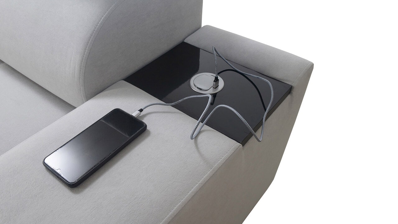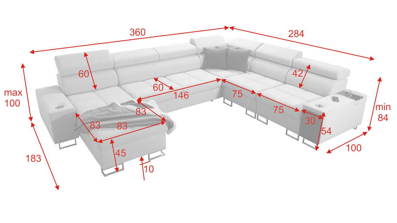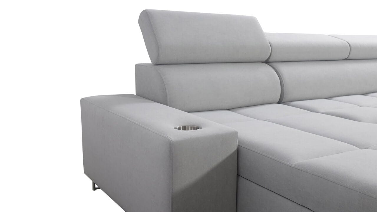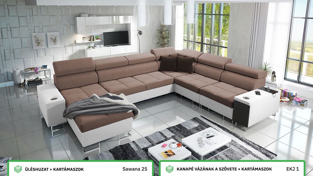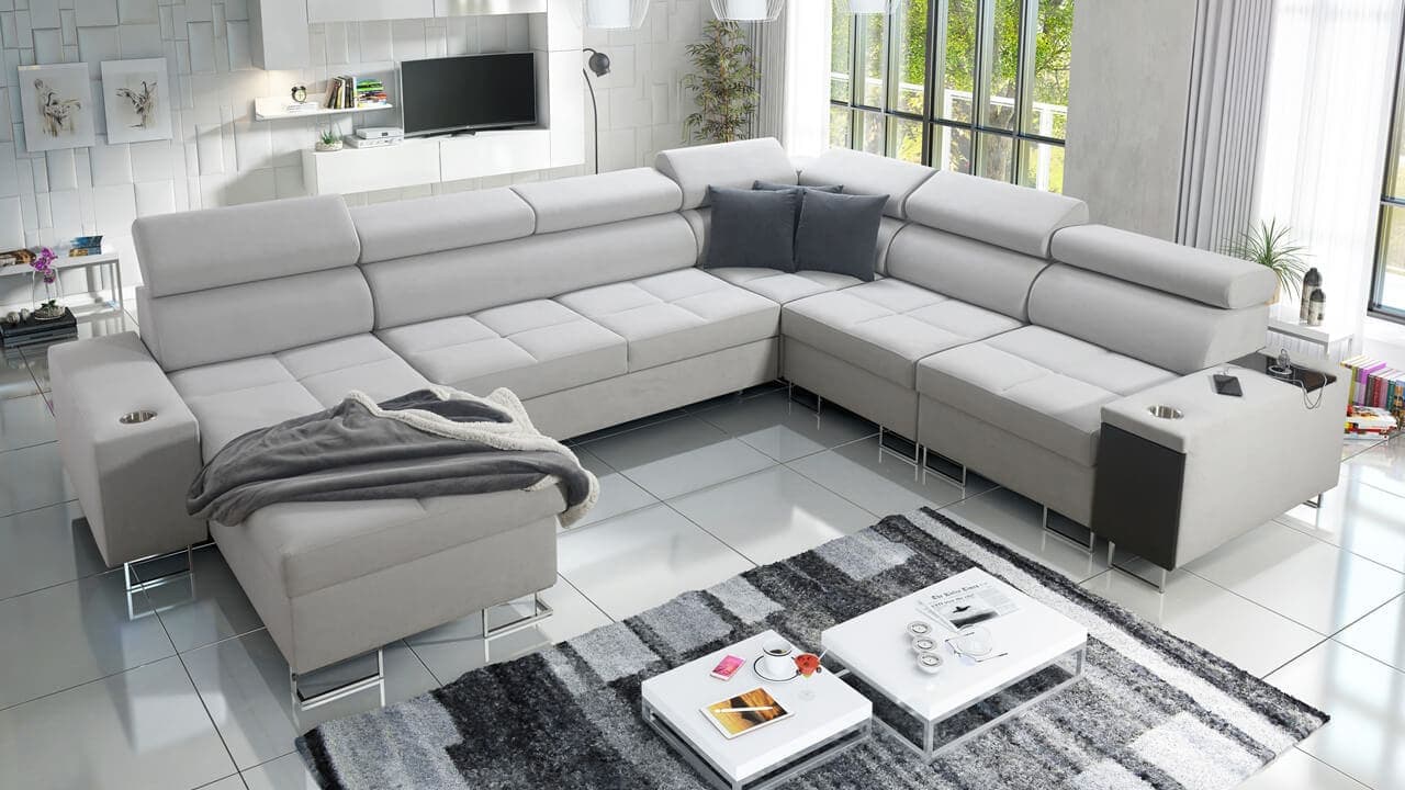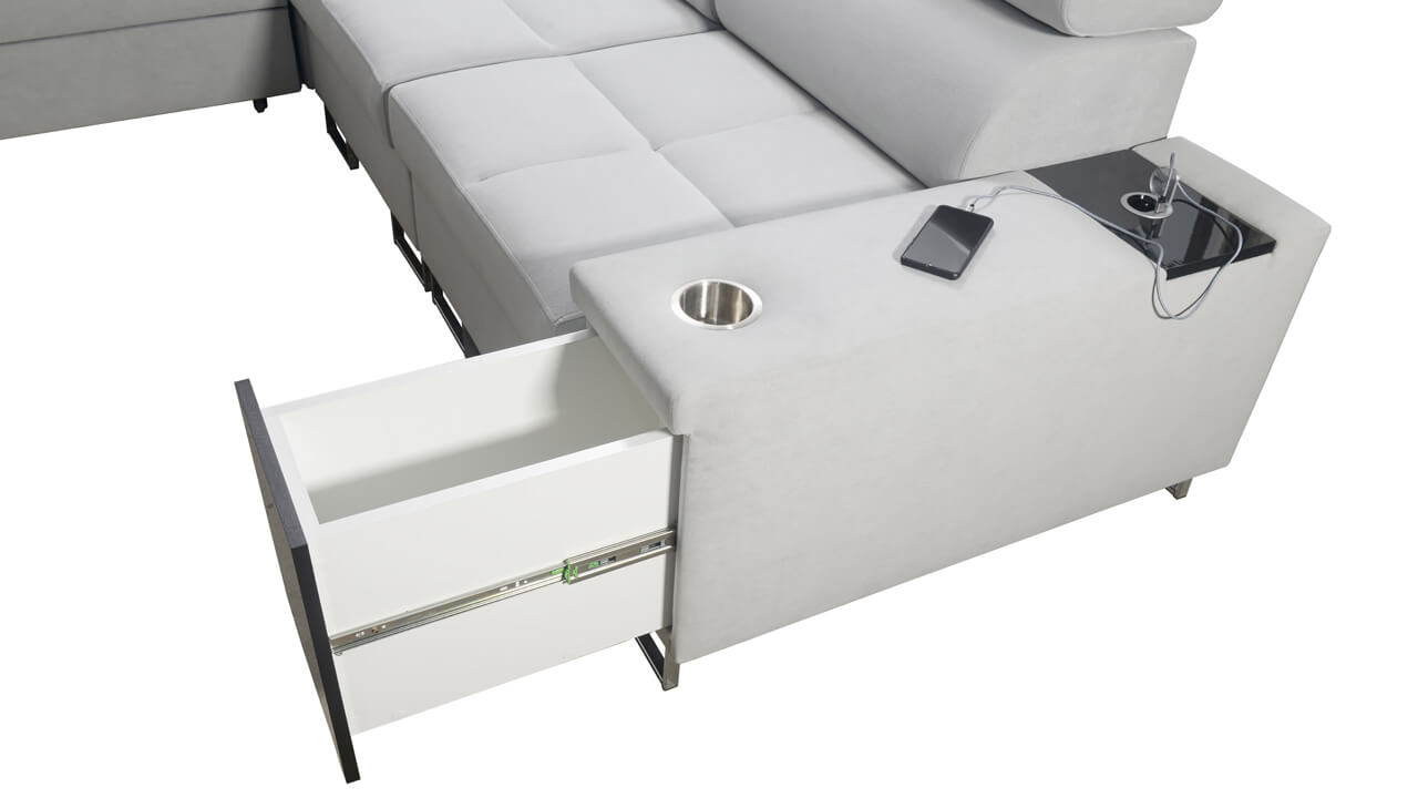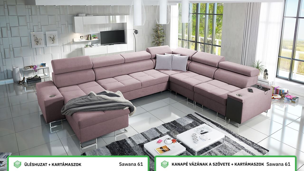 Ezen az igazán tágas U alakú kanapén kényelmesen elfér az egész család vagy egy nagyobb vendégség. Minőségi konstrukciója nagyobb súlyokat is elbír, és biztosítja, hogy a kanapé még évek múltán se válljon széttülté. Az igazi kényelem érdekében élvezheti az állítható fejtámlákat, a beépített minibárt, a pohártartókat és a beépített töltőállomást.