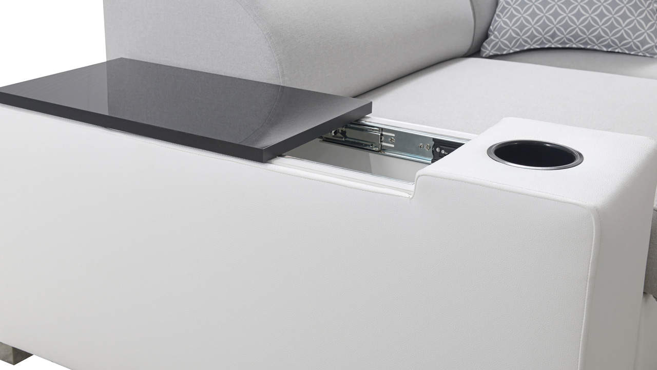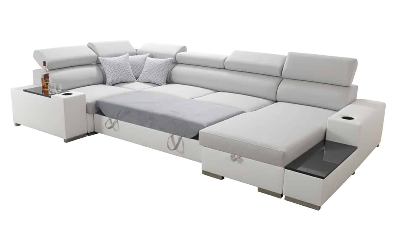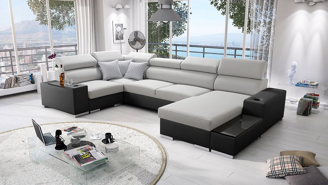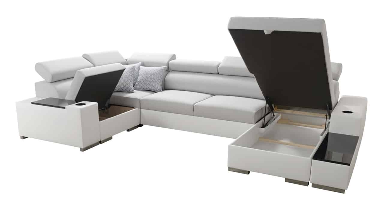 Exkluzív U alakú kanapé az oldalsó karfába épített bárpultokkal. A fényes teteje kis pultként szolgál, és mindkét kartámaszban van egy-egy beépített pohártartó. A bútorlap színét, a konzolok színét, a lábak típusát és a kárpitanyagot tetszés szerint kombinálhatja.