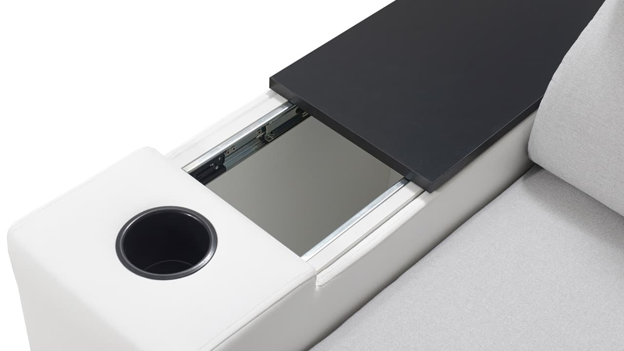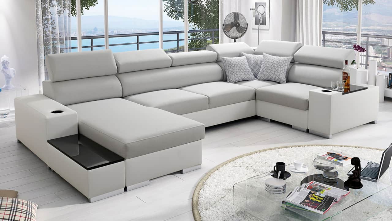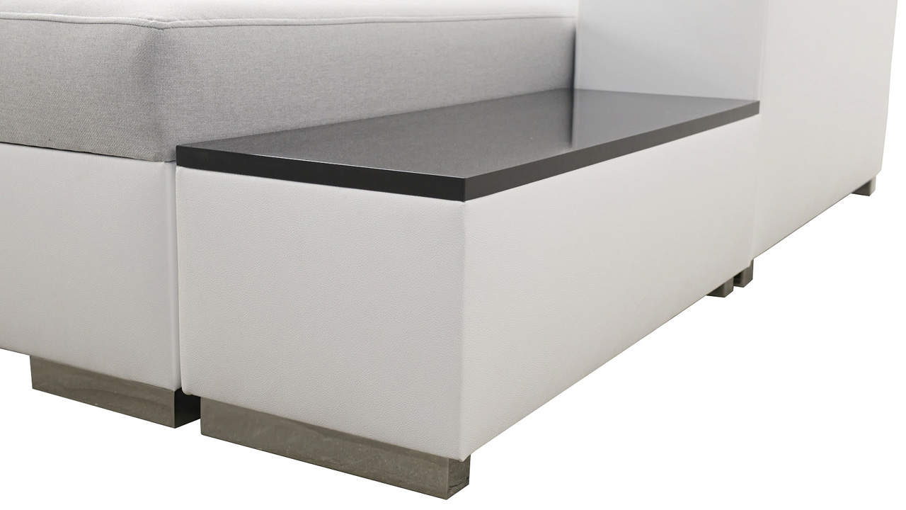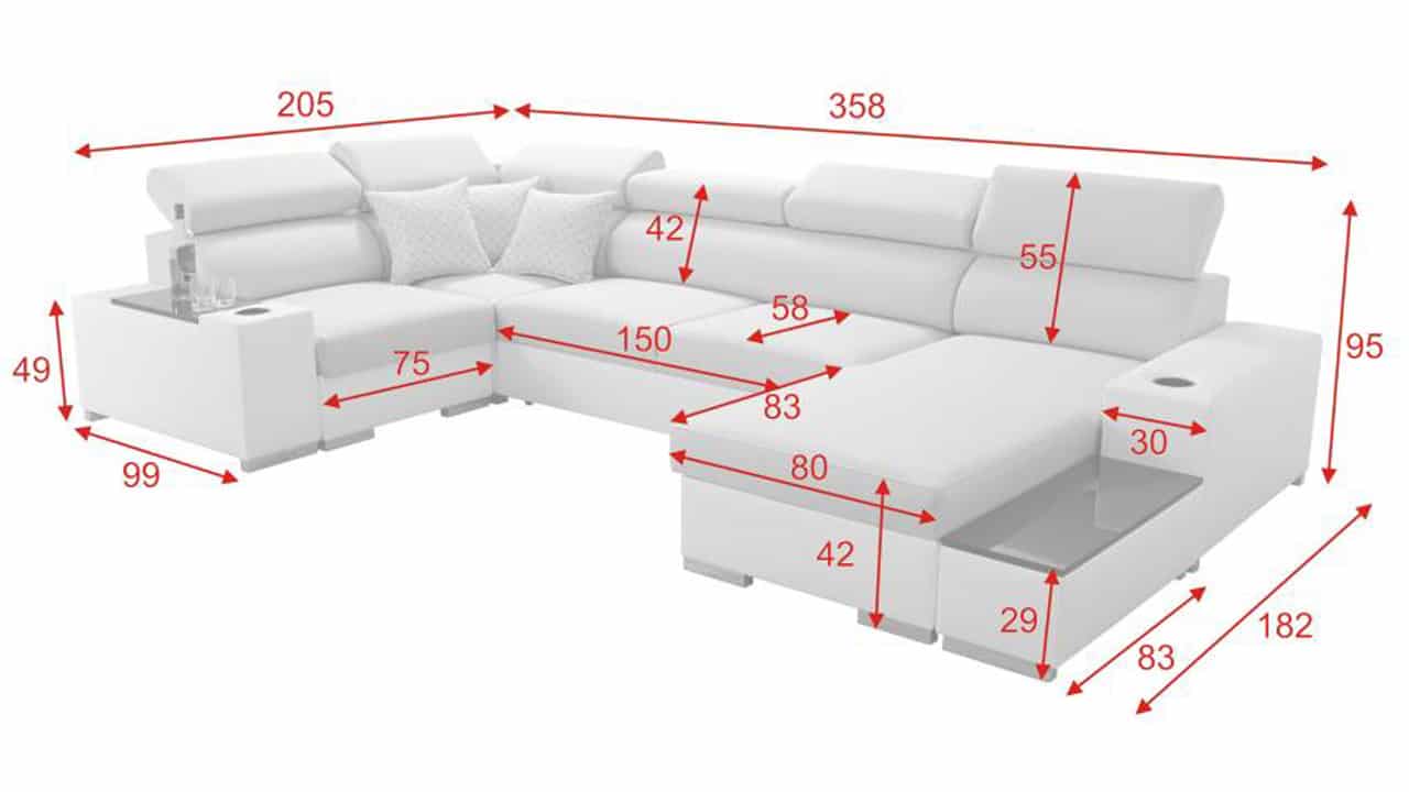 Exkluzív U alakú kanapé az oldalsó karfába épített bárpultokkal. A fényes teteje kis pultként szolgál, és mindkét kartámaszban van egy-egy beépített pohártartó. A bútorlap színét, a konzolok színét, a lábak típusát és a kárpitanyagot tetszés szerint kombinálhatja.