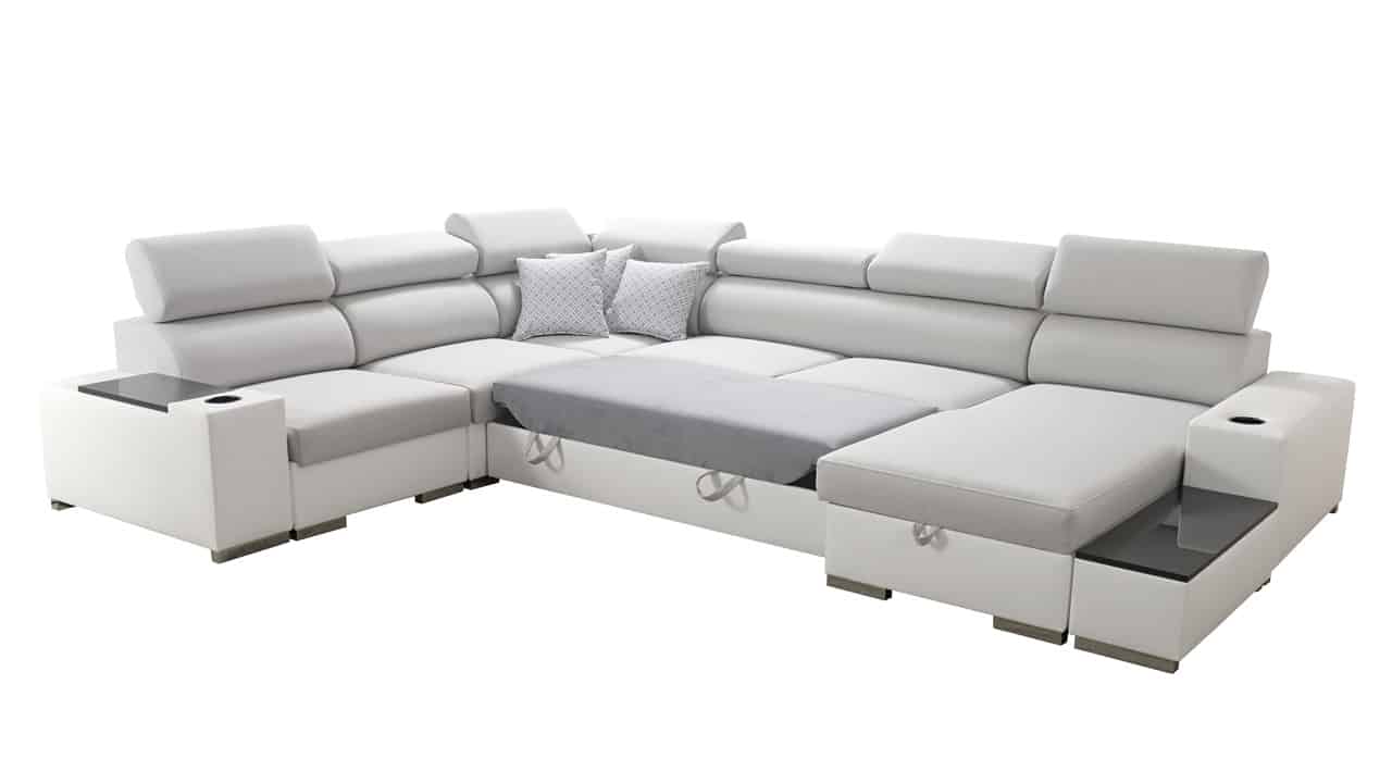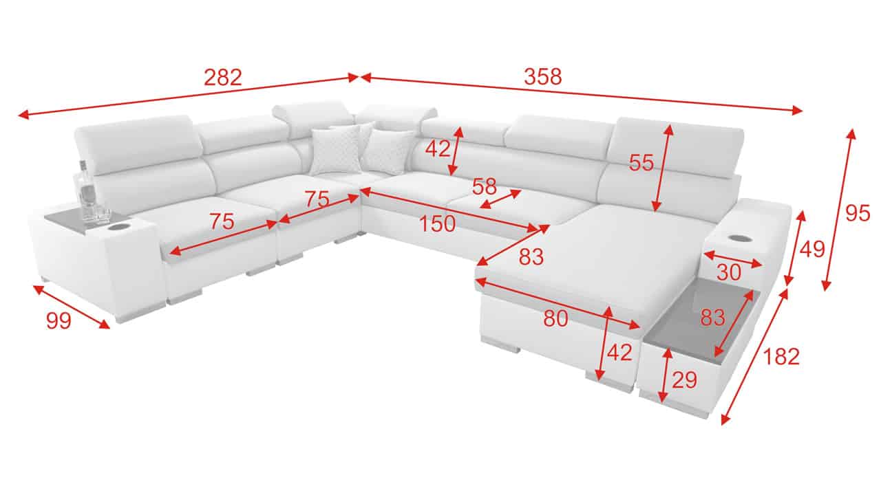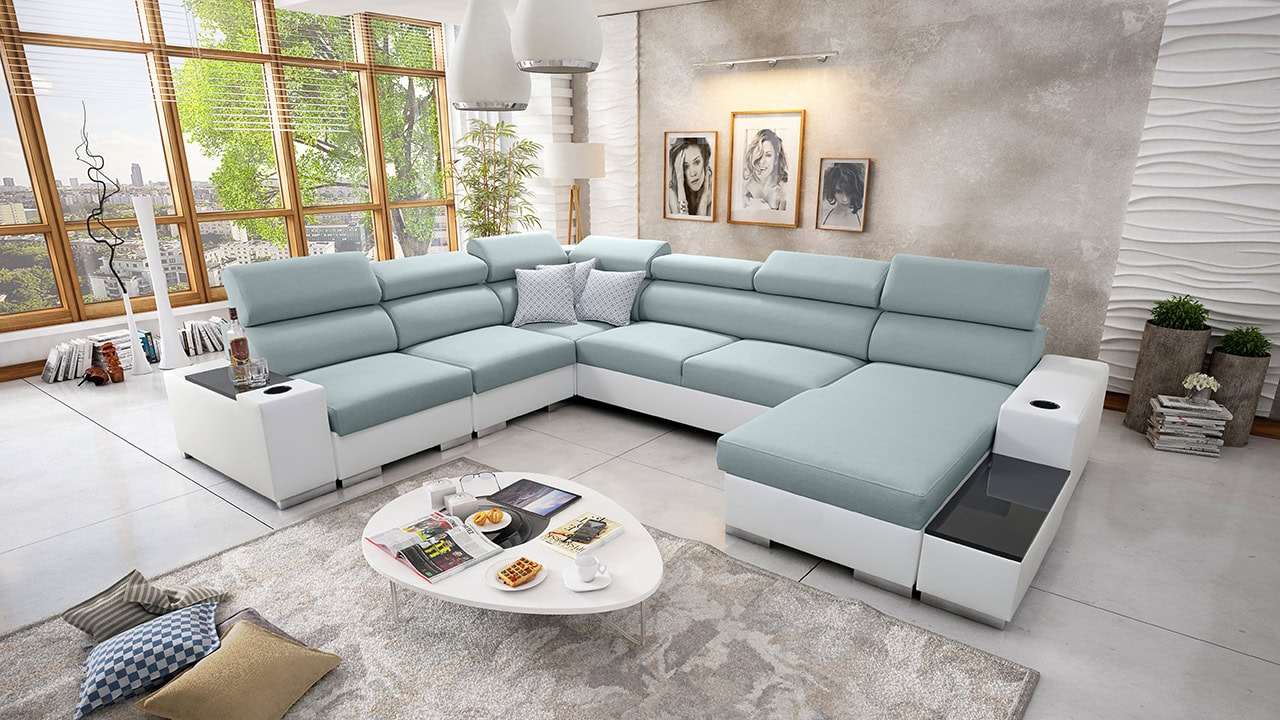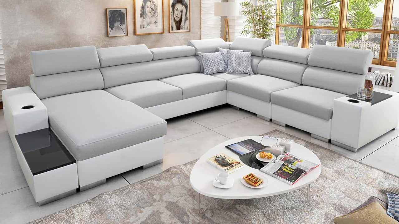 A nagy U alakú kanapé exkluzív modellje különösen nagy kényelmet nyújt majd leendő tulajdonosainak. A kanapé kiváló minőségű, állítható fejtámlával, pohártartókkal és beépített minibárral rendelkezik, így minden kéznél lesz.