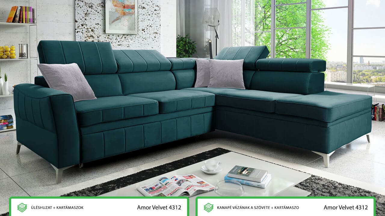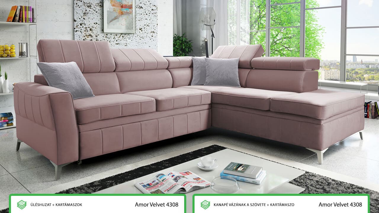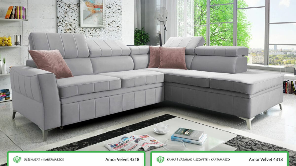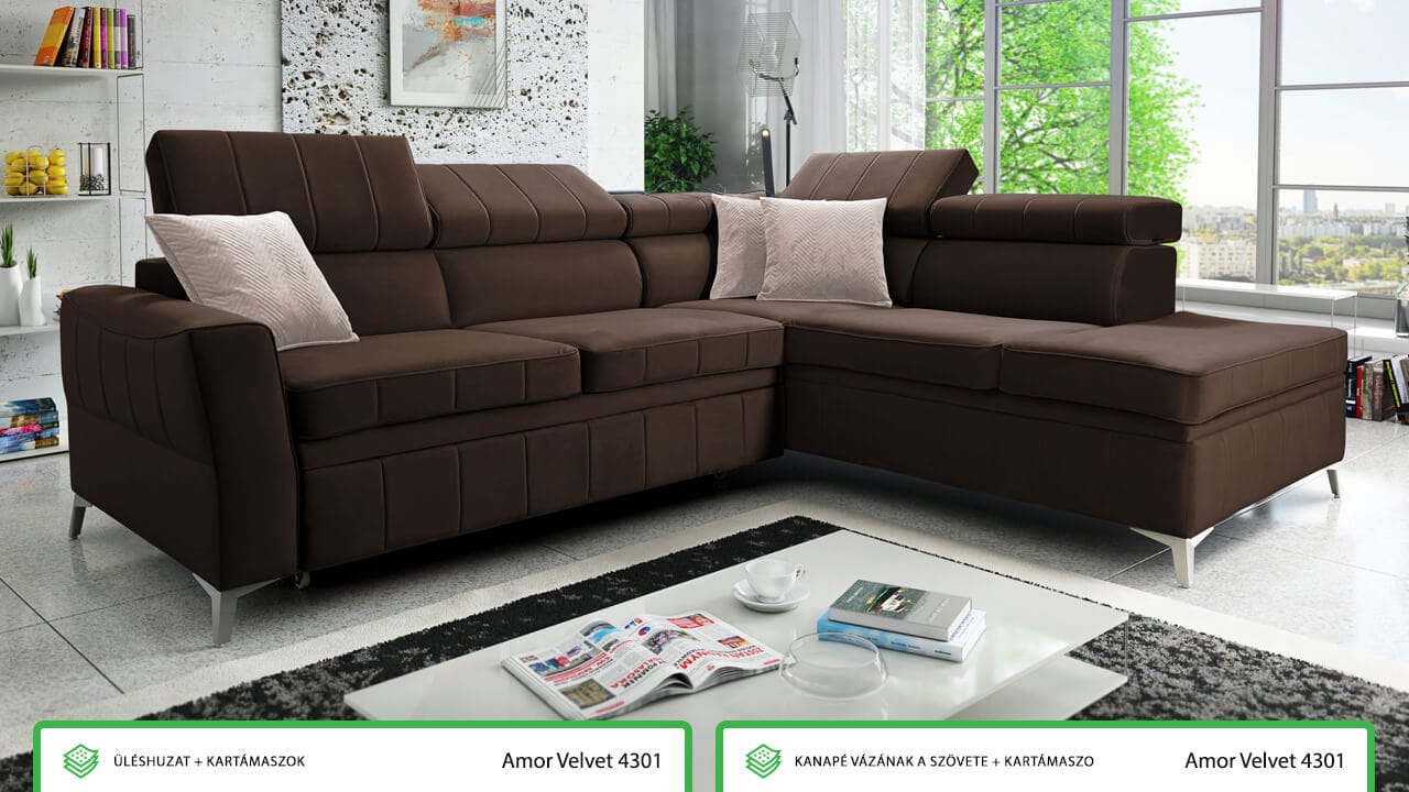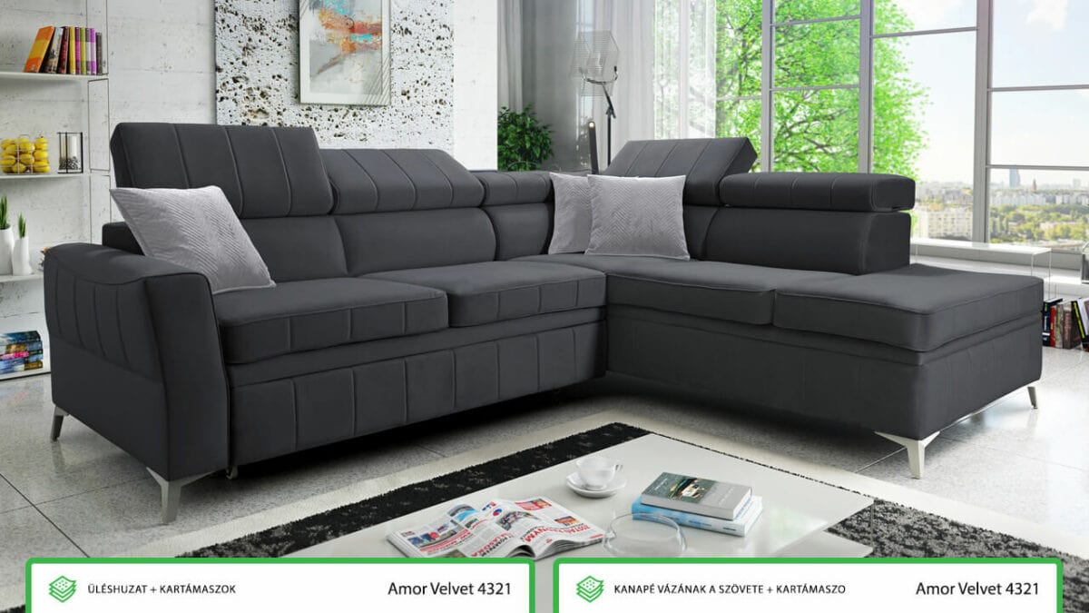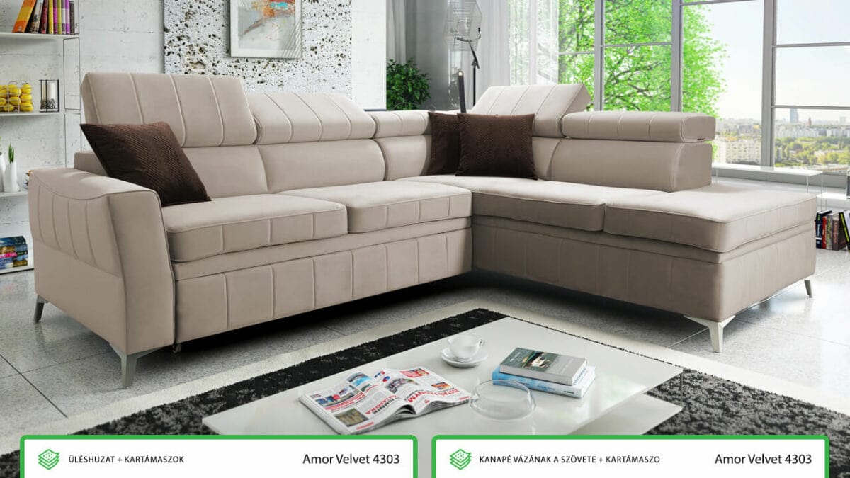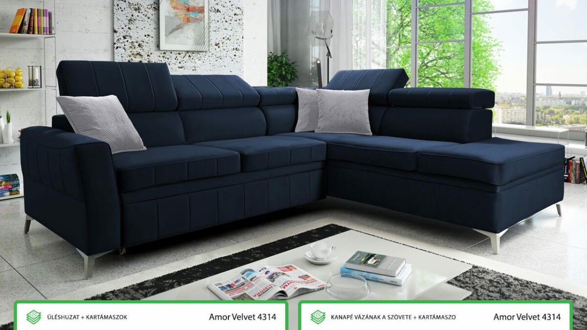 L alakú sarokkanapé, melyet tetszése szerint alakíthat. Rendelkezésére áll több tucat kárpitanyag, melyeknek köszönhetően álmai kanapéját hozhatja létre. Különleges varrással és magas modern lábakkal rendelkezik. Nem szabad megfeledkezni pár praktikus funkcióról sem – állítható fejtámlák, nagy tárolóhely és kihajtható.