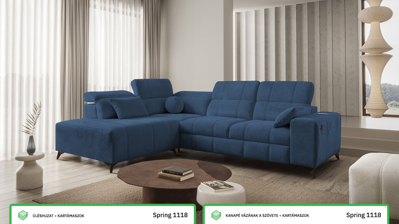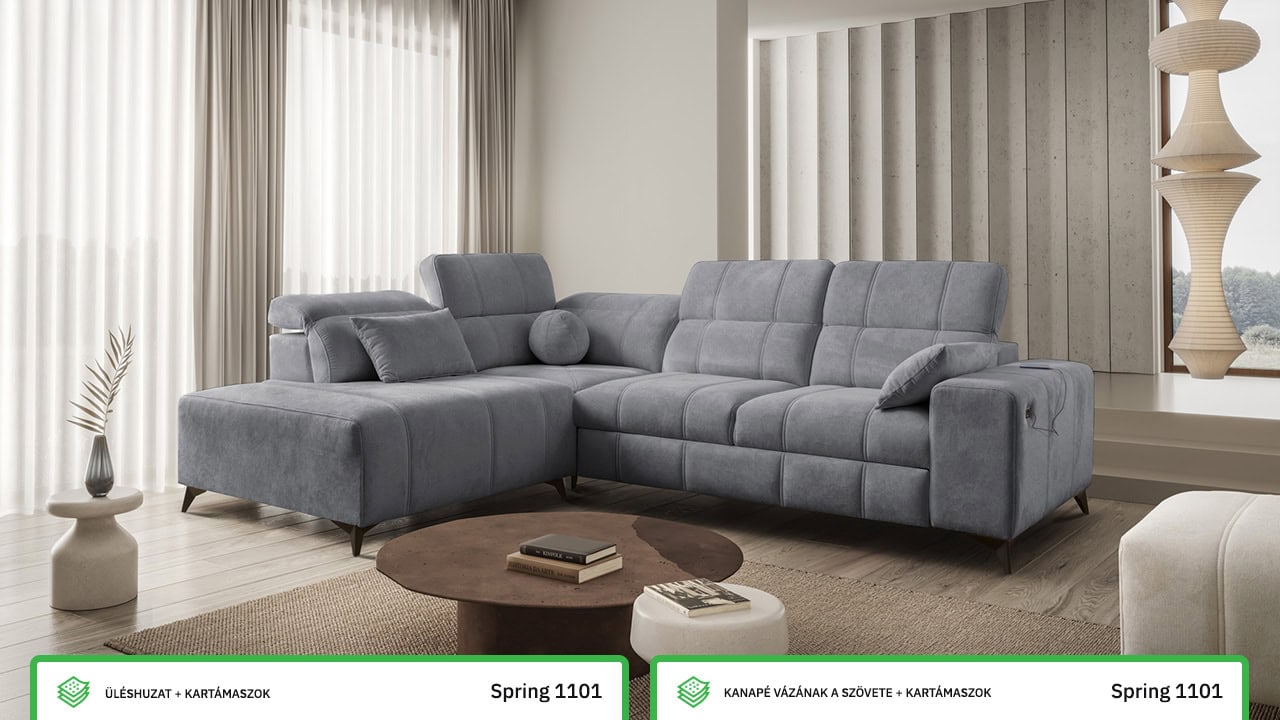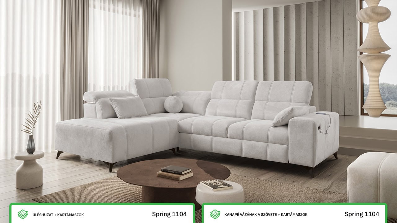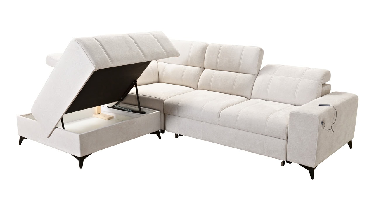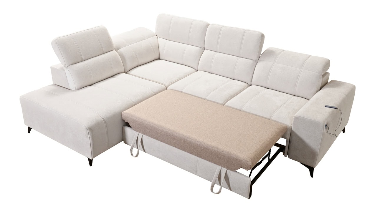 Daffy VII sarokkanapé egy kifinomult, elegáns és stílusos bútordarab nappalijába. Válasszon kínálatunkból bármilyen anyagot, és alakítson ki egy olyan kanapét, amely minden álmát megvalósítja. Elegáns vonalakat, érdekes varrást és kényelmes üléseket adtunk hozzá állítható kartámaszokkal és beépített töltőállomással. Magától értetődik, hogy van tárolóhely és kihúzható ággyal is rendelkezik, ami alkalmankénti alvást tesz lehetővé a látogatók számára.