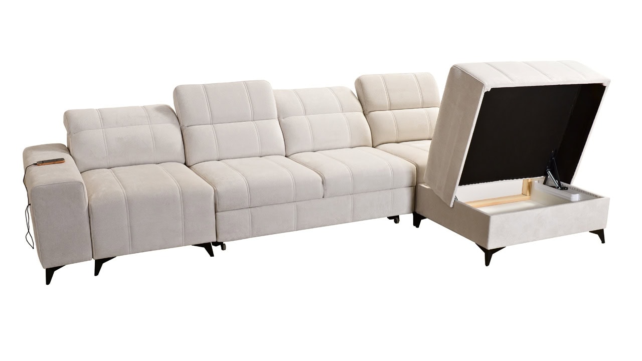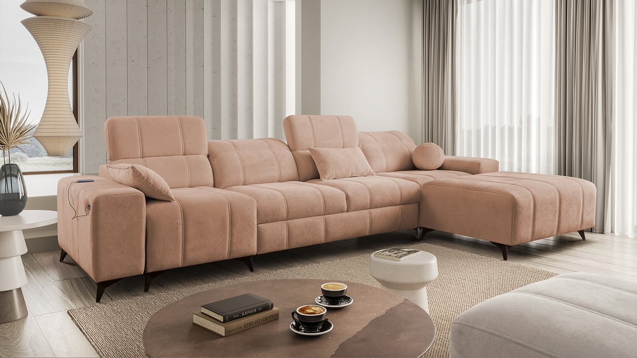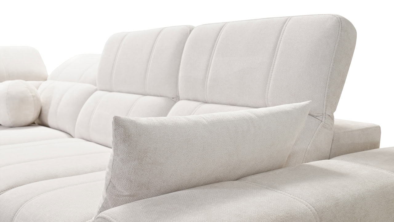 A Daffy XII sarokkanapé atipikus méretű, nagy szélességű, nyitott heverő végű szárnyal. A kanapé ötvözi a kényelmet és az elegáns dizájnt, és egy kis luxust visz a nappaliba. Válasszon kínálatunkból a kiváló minőségű fedőanyagok egyikét földes, pasztell, univerzális vagy akár extravagáns árnyalatokban. A kanapén praktikus fejlesztések is találhatók, például kihúzható ágy, tárolóhely, állítható fejtámlák, kihajtható lábtámasz és beépített töltőállomás.