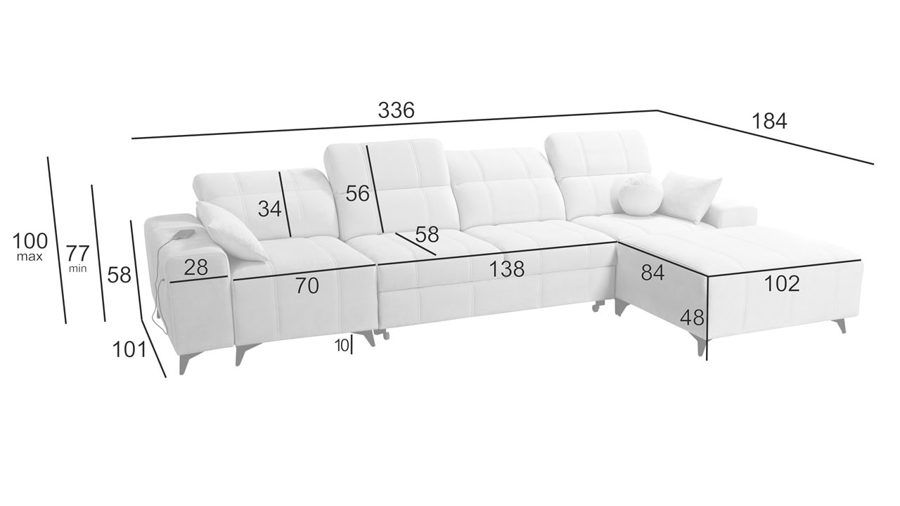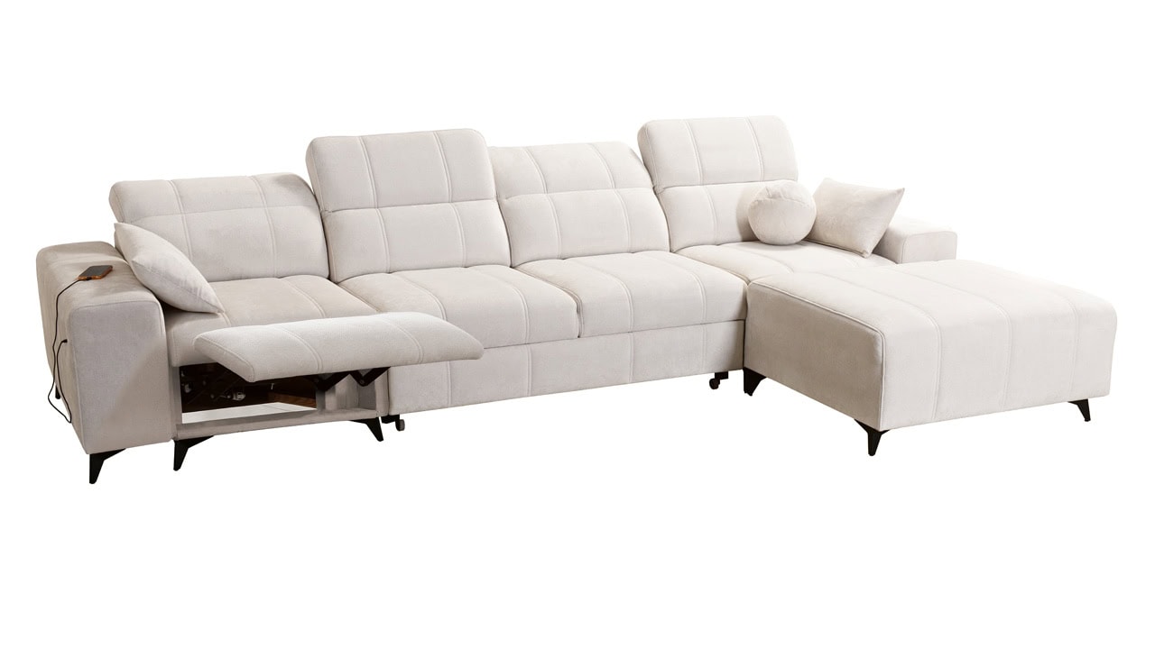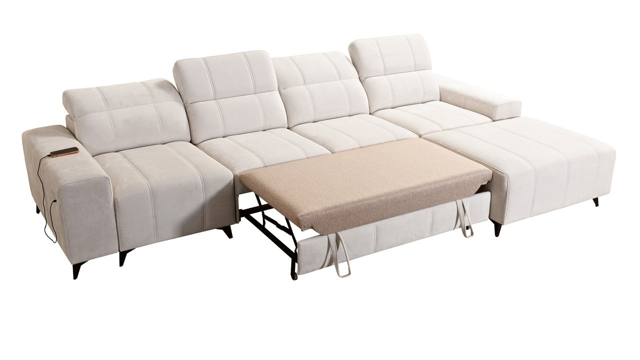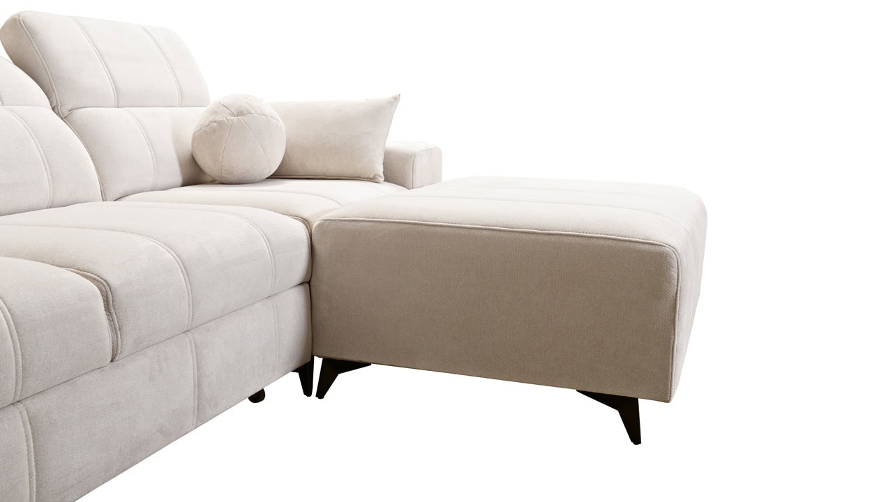 A Daffy XII sarokkanapé atipikus méretű, nagy szélességű, nyitott heverő végű szárnyal. A kanapé ötvözi a kényelmet és az elegáns dizájnt, és egy kis luxust visz a nappaliba. Válasszon kínálatunkból a kiváló minőségű fedőanyagok egyikét földes, pasztell, univerzális vagy akár extravagáns árnyalatokban. A kanapén praktikus fejlesztések is találhatók, például kihúzható ágy, tárolóhely, állítható fejtámlák, kihajtható lábtámasz és beépített töltőállomás.