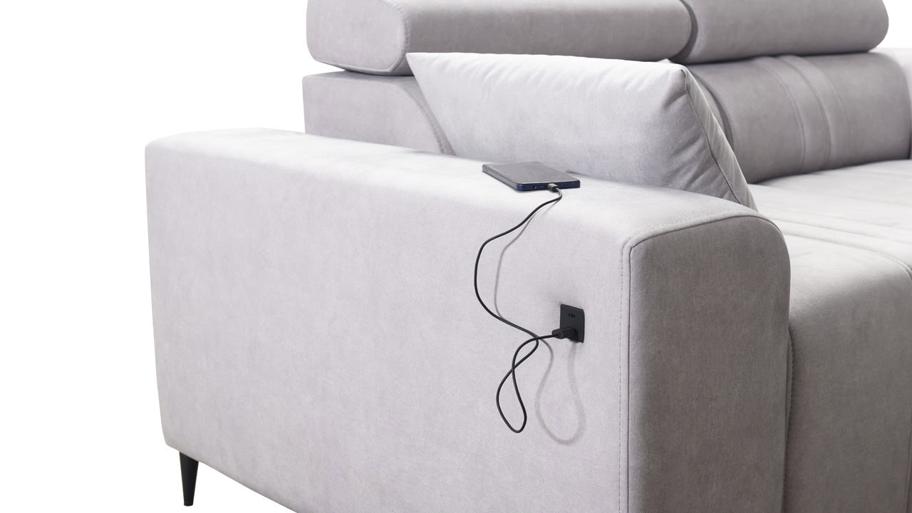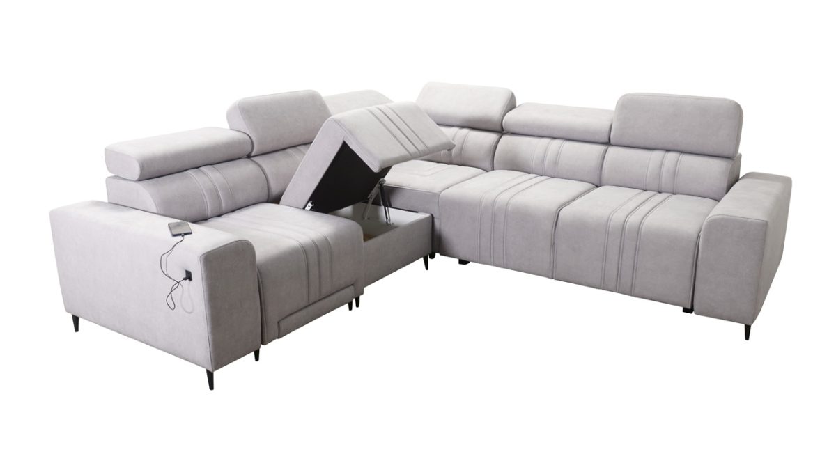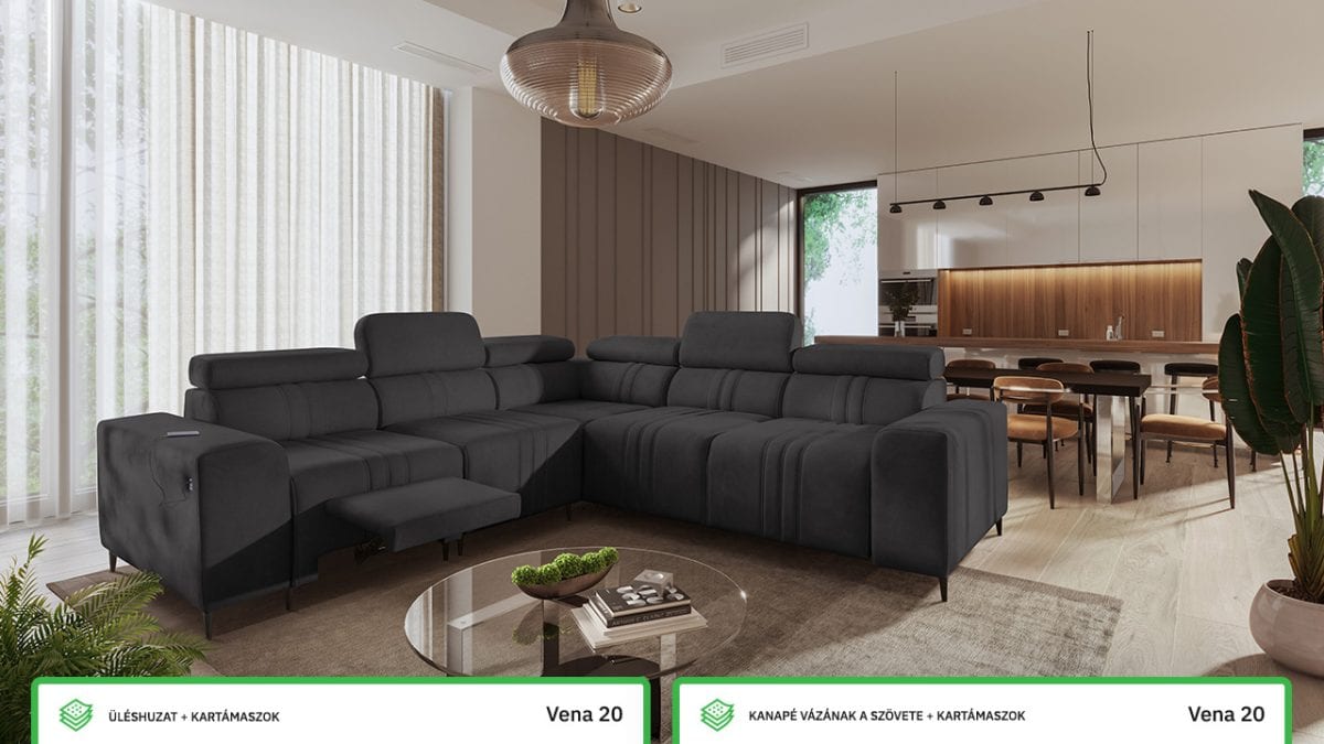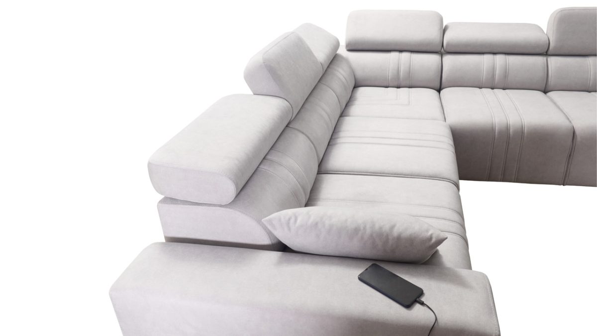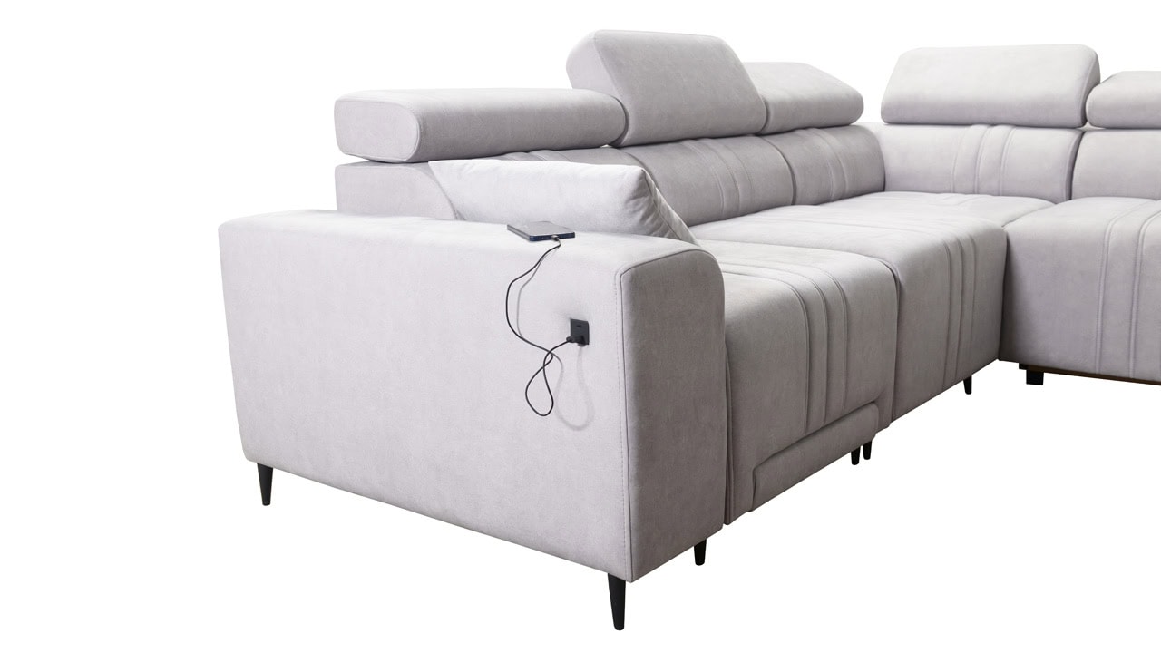 A masszív megjelenésű Fabio III sarokkanapé maximális kényelmet biztosít. Fejtámlákkal, USB töltővel és kihúzható ággyal van felszerelve. Választhatja akár tárolóhellyel rendelkező, vagy akár lábtartós változatban. Bármilyen színben gyönyörűen kiemelkedik – világos krém vagy bézs, sötétszürke és barna, de kifejezőbb rózsaszín, zöld vagy sárga árnyalatokban is. Mintakönyvünkből tetszőleges anyagot választhat rá.