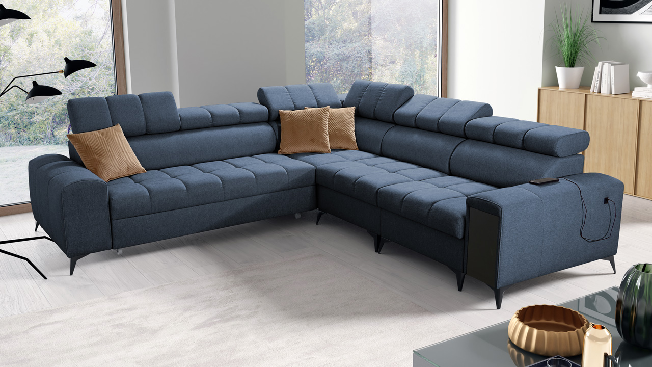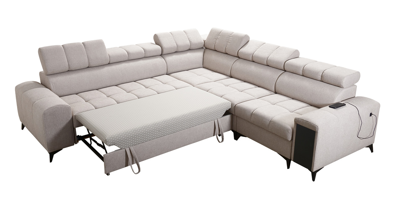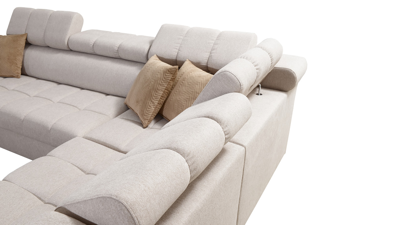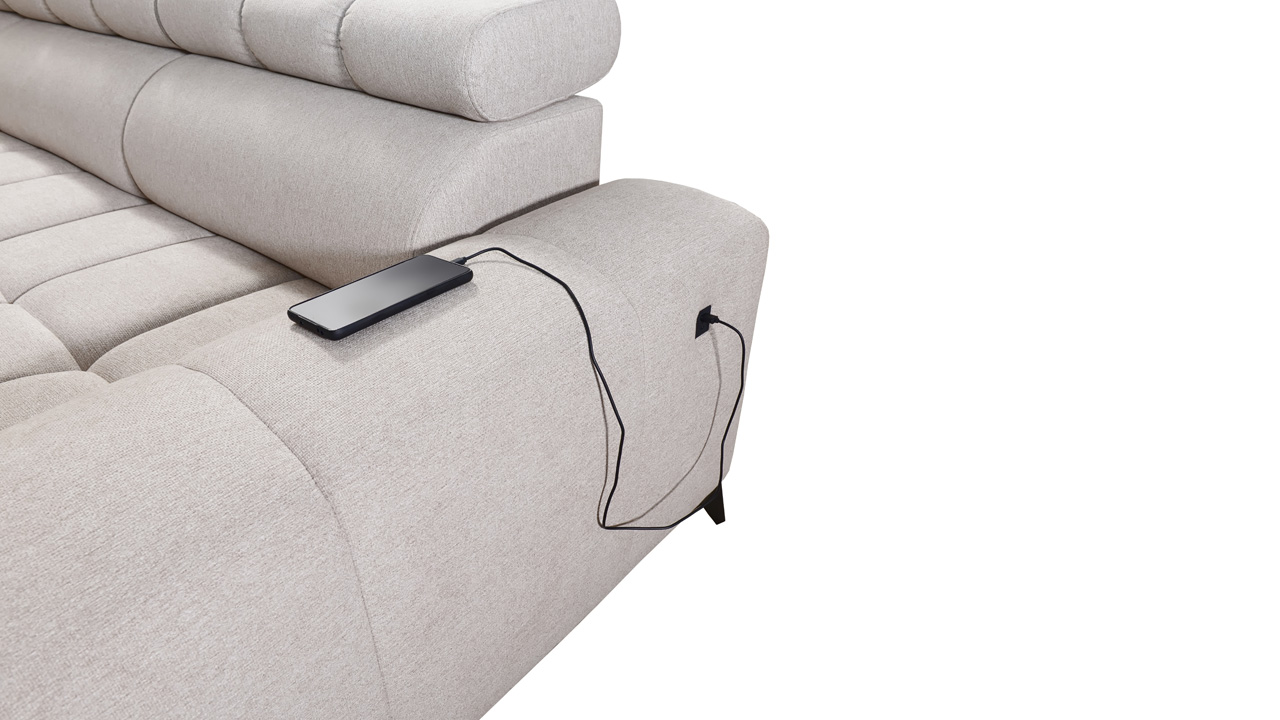 Modern kanapé, amely egyesíti a funkcionalitást és az elegáns dizájnt. Gyakorlati szempontból mindenképpen értékelni fogja tárhelyét, USB portját, beépített minibárját és a kihajtható ágyat is. Az állítható fejtámlák szintén az Ön kényelmét szolgálják. Kialakítását tekintve a kanapé modern magas lábakkal és érdekes varrás kialakítású ülőrésszel rendelkezik, ami csavart ad neki. A kanapét bármilyen anyaggal elkészítjük Önnek (kivéve Erie, Bristol és BAHAMA anyagokat).