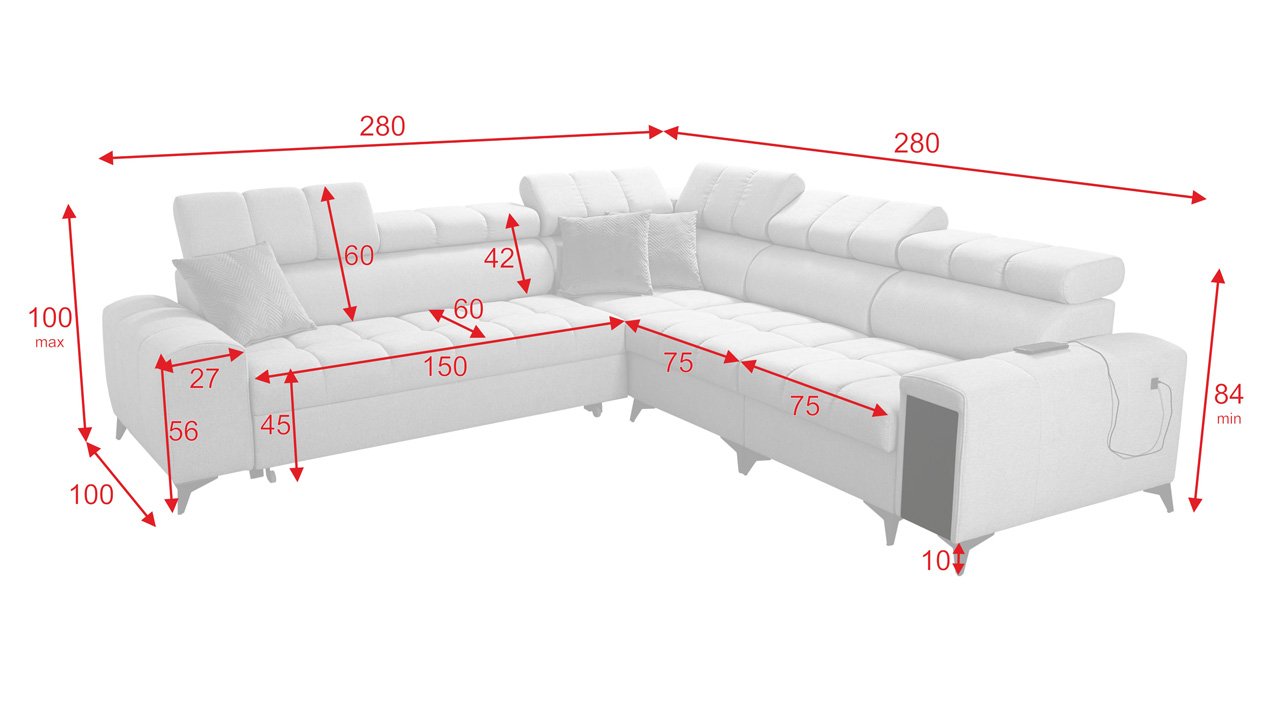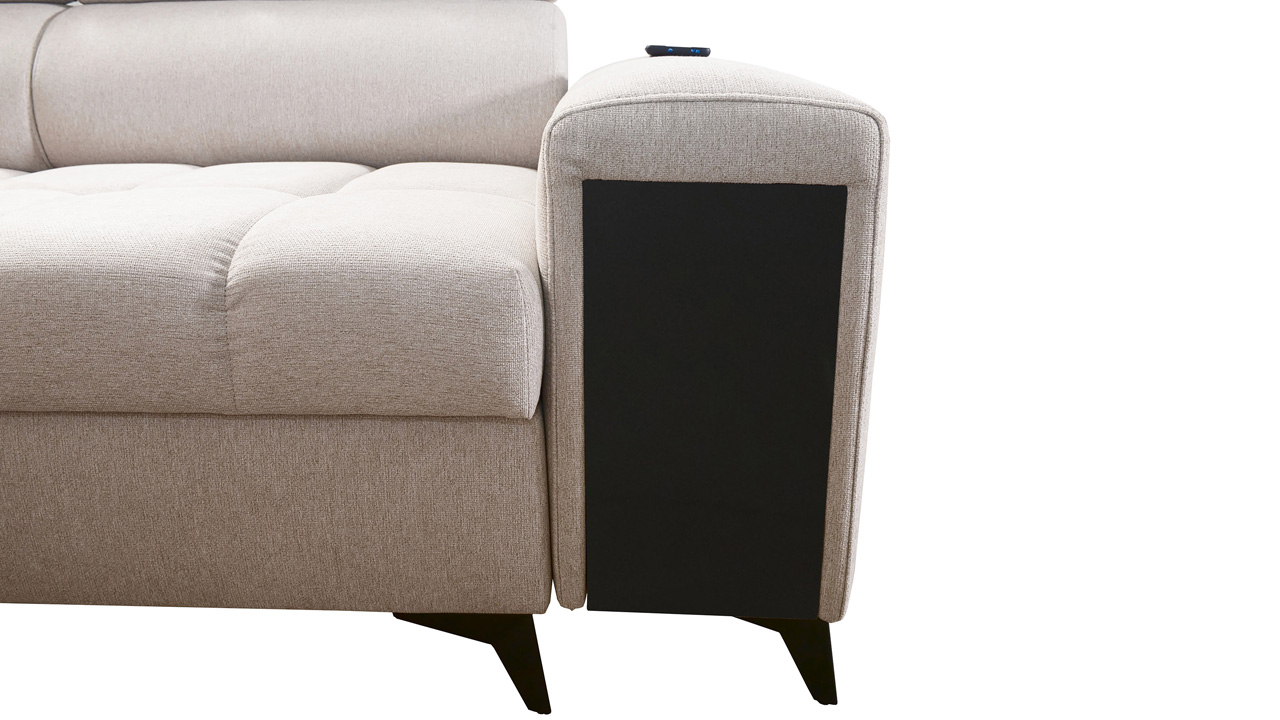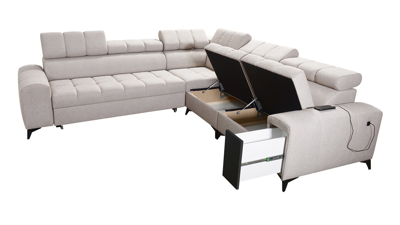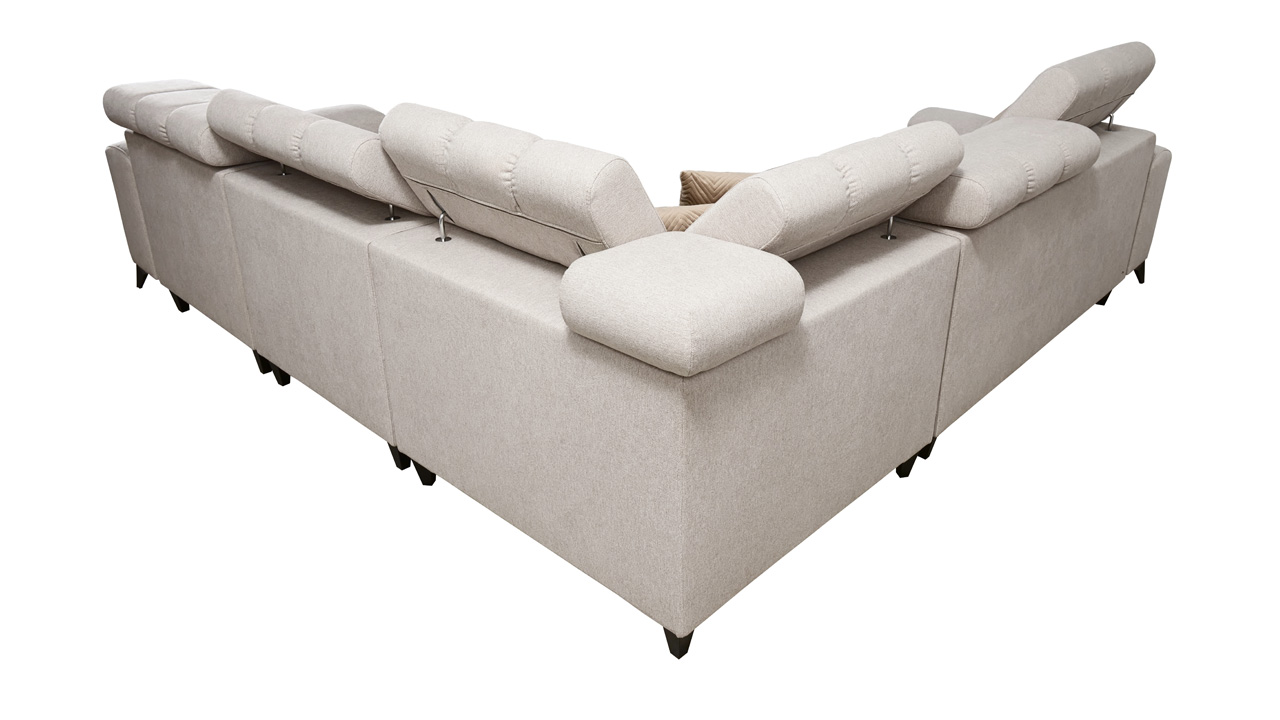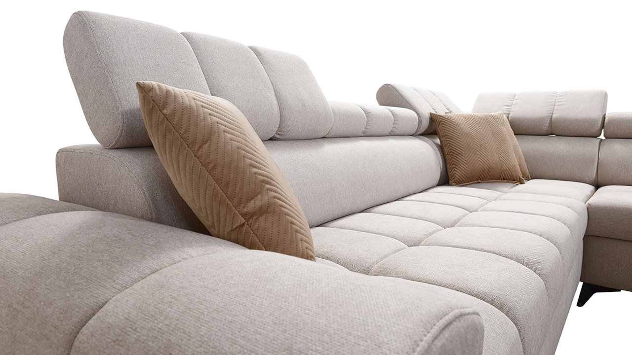 Modern kanapé, amely egyesíti a funkcionalitást és az elegáns dizájnt. Gyakorlati szempontból mindenképpen értékelni fogja tárhelyét, USB portját, beépített minibárját és a kihajtható ágyat is. Az állítható fejtámlák szintén az Ön kényelmét szolgálják. Kialakítását tekintve a kanapé modern magas lábakkal és érdekes varrás kialakítású ülőrésszel rendelkezik, ami csavart ad neki. A kanapét bármilyen anyaggal elkészítjük Önnek (kivéve Erie, Bristol és BAHAMA anyagokat).