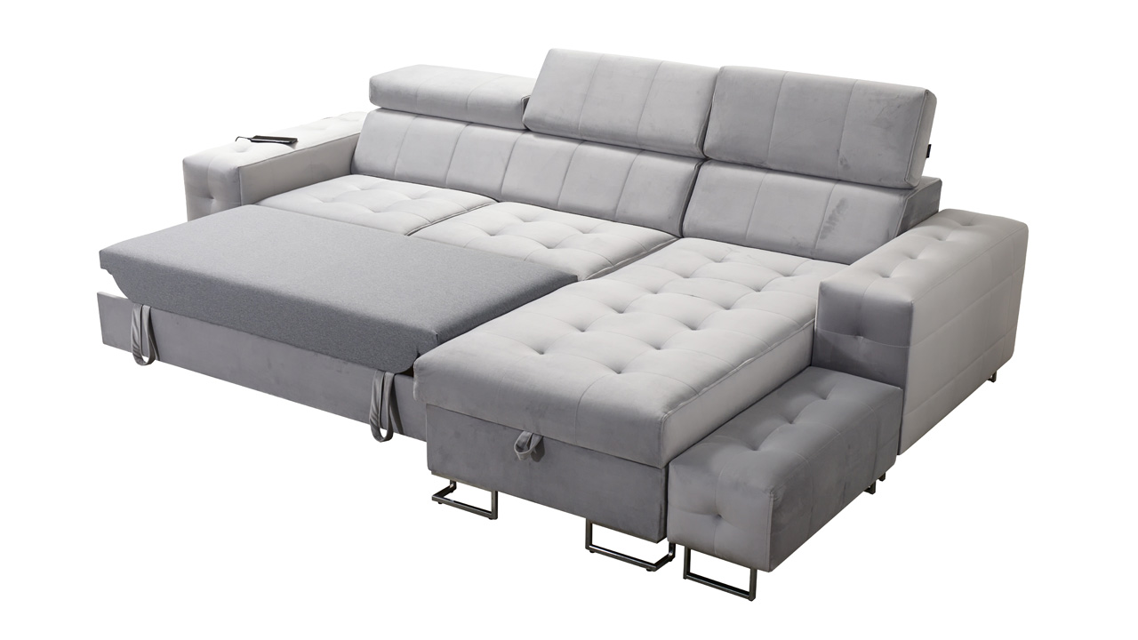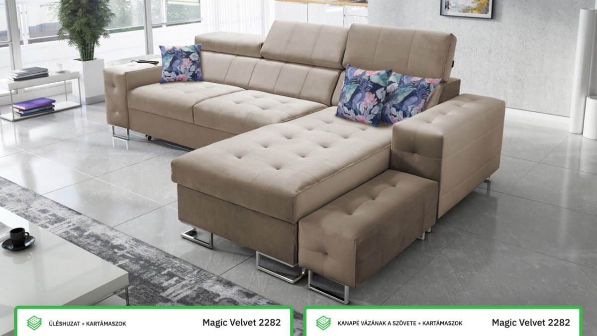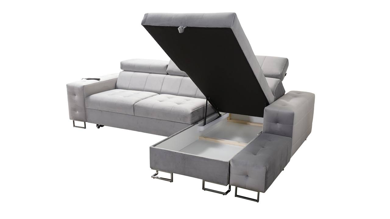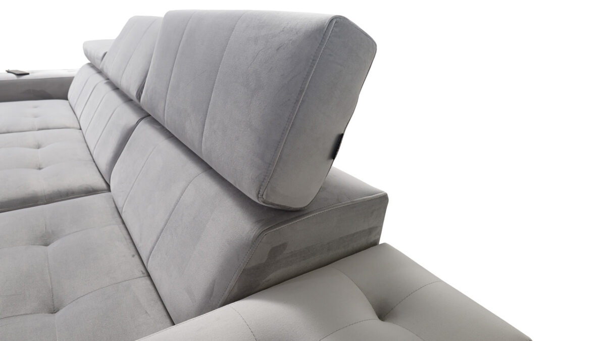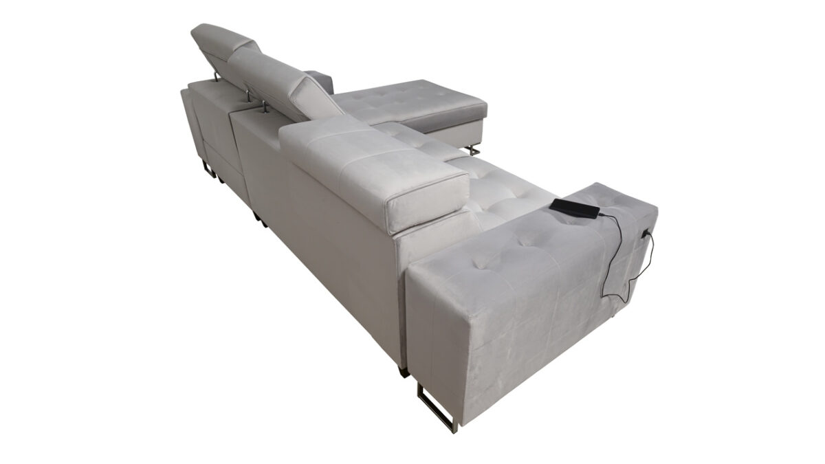Ez a modern sarokkanapé tökéletes választás minden nappaliba. Nagyon jó választás, mivel nemcsak kényelmes, hanem tárolóhelyekkel is rendelkezik, valamint alkalmi alváshoz is megfelel. Állítható fejtámlákkal is rendelkezik, ami a maximális kényelmet biztosítja a mindennapi pihenéshez. Szintén értékelni fogja az egyszerűen működő szétnyitható ágyat, amit a vendégei is díjazni fognak. Ezen kívül a kanapé beépített töltőállomással és puffal rendelkezik.