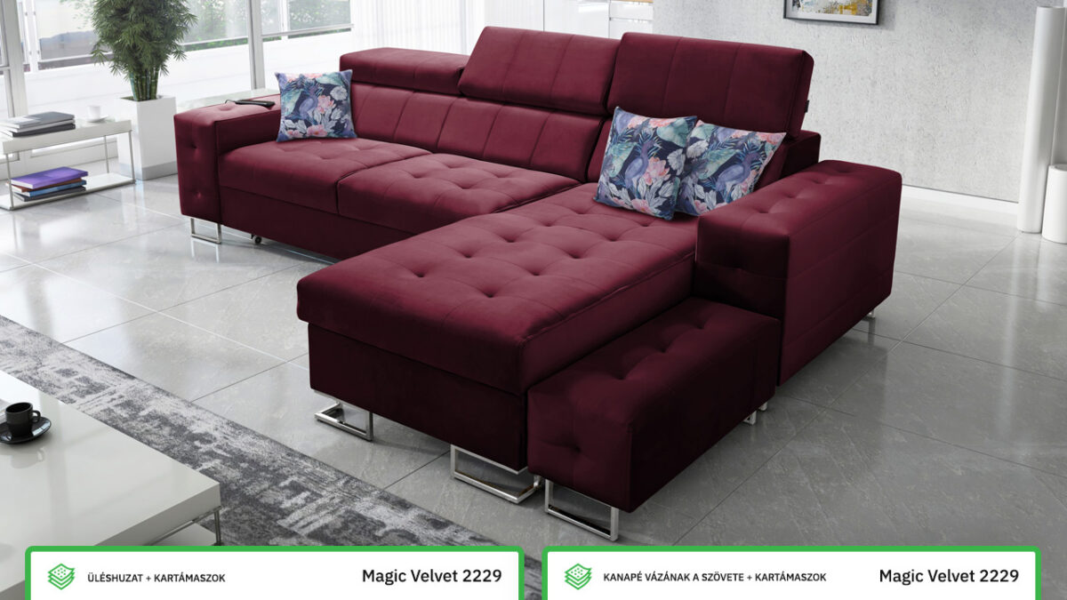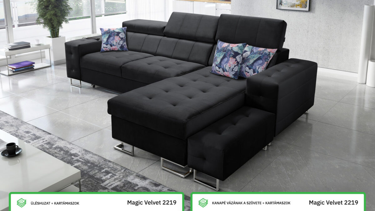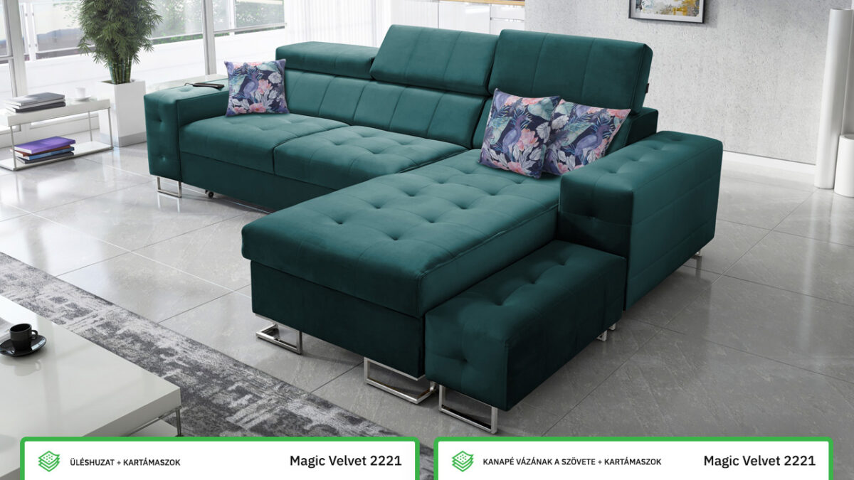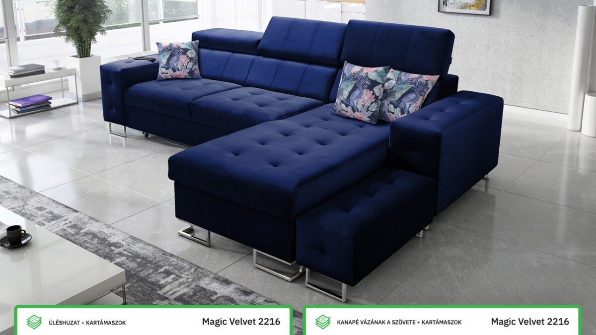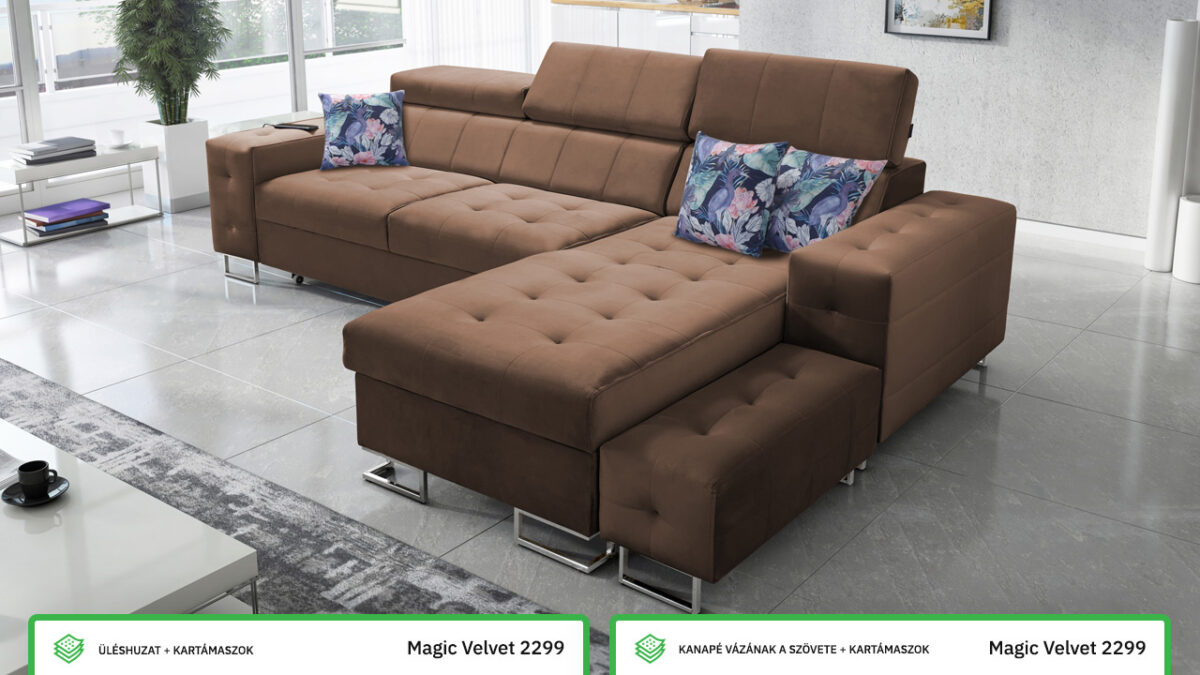 Ez a modern sarokkanapé tökéletes választás minden nappaliba. Nagyon jó választás, mivel nemcsak kényelmes, hanem tárolóhelyekkel is rendelkezik, valamint alkalmi alváshoz is megfelel. Állítható fejtámlákkal is rendelkezik, ami a maximális kényelmet biztosítja a mindennapi pihenéshez. Szintén értékelni fogja az egyszerűen működő szétnyitható ágyat, amit a vendégei is díjazni fognak. Ezen kívül a kanapé beépített töltőállomással és puffal rendelkezik.