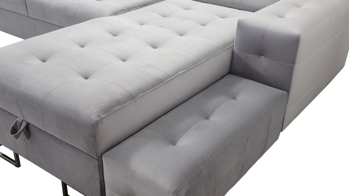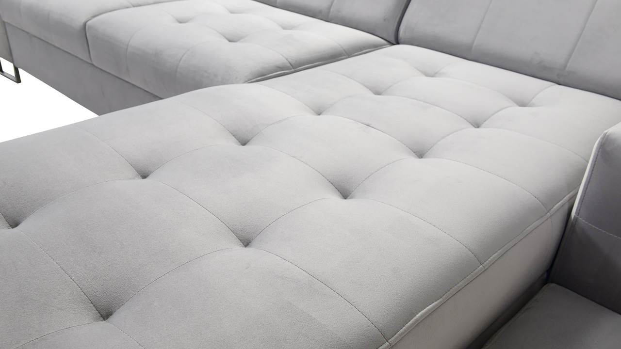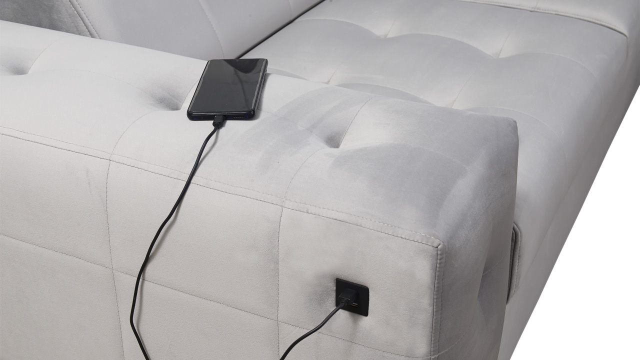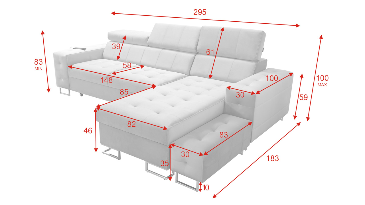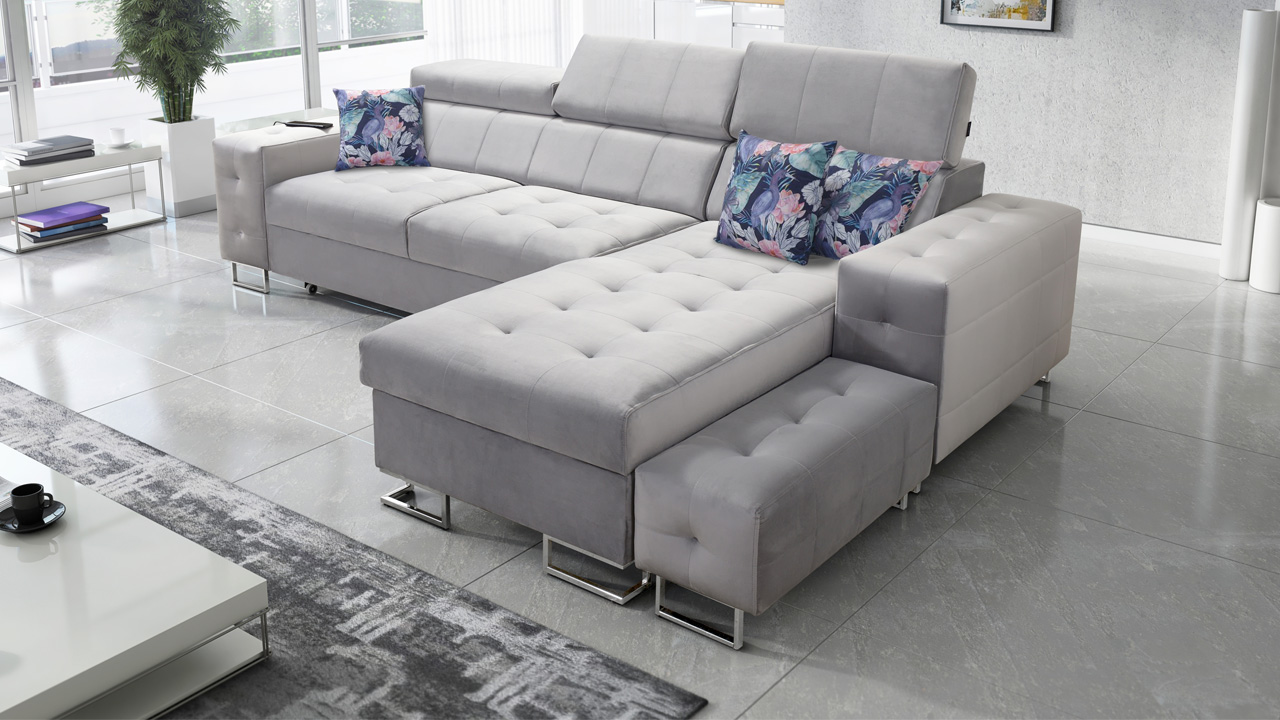 Ez a modern sarokkanapé tökéletes választás minden nappaliba. Nagyon jó választás, mivel nemcsak kényelmes, hanem tárolóhelyekkel is rendelkezik, valamint alkalmi alváshoz is megfelel. Állítható fejtámlákkal is rendelkezik, ami a maximális kényelmet biztosítja a mindennapi pihenéshez. Szintén értékelni fogja az egyszerűen működő szétnyitható ágyat, amit a vendégei is díjazni fognak. Ezen kívül a kanapé beépített töltőállomással és puffal rendelkezik.