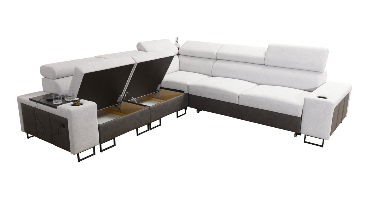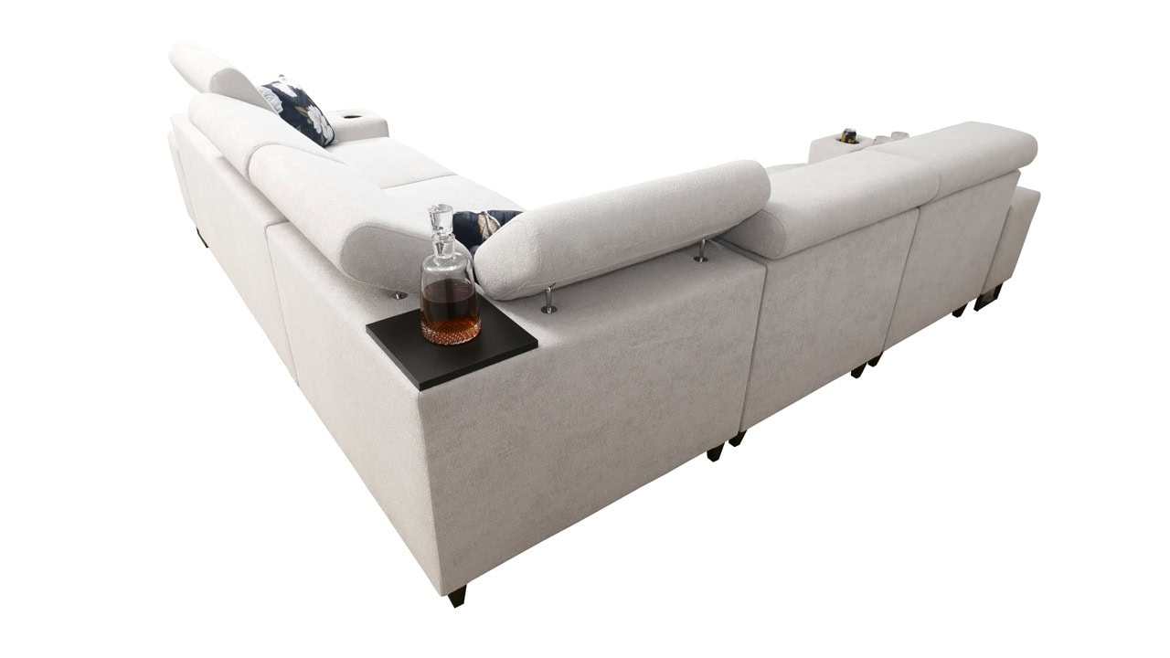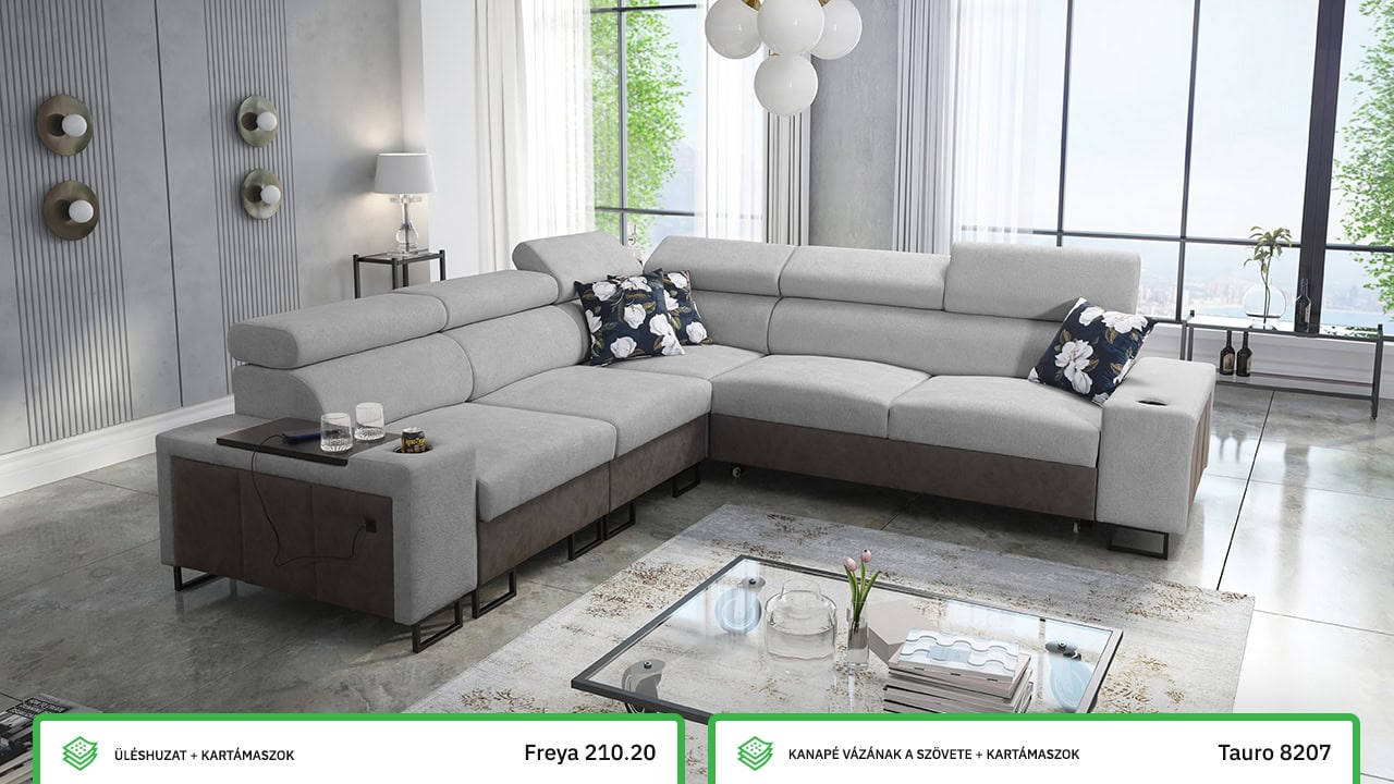 A Melodia III sarokkanapé rendkívüli kényelmet és funkcionalitást kínál egyben. A kihajtható ággyal, a tárolóhellyel, a beépített minibárral és az elegáns kialakítással a nappali gyönyörű és praktikus központi eleme lesz. A mintakönyvből válassza ki ízlése szerint a borítóanyagot, és készíttesse el az ülőgarnitúrát az Ön által választott színben.