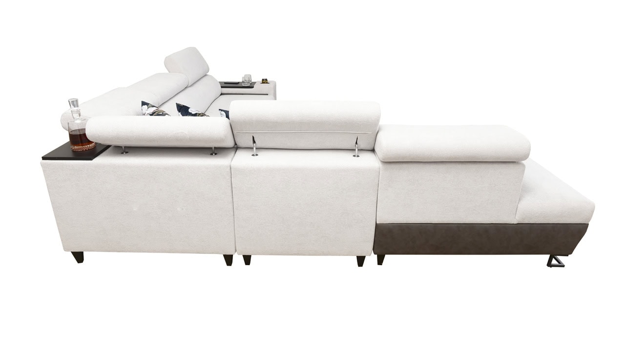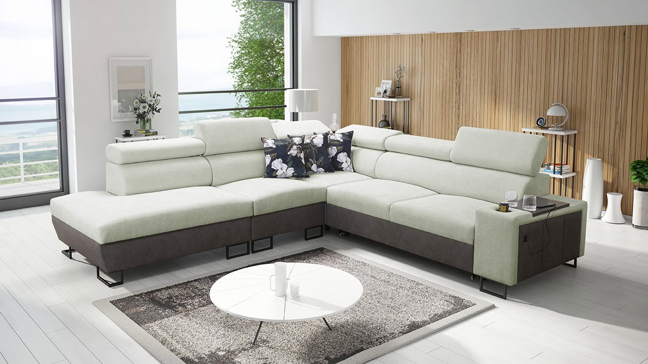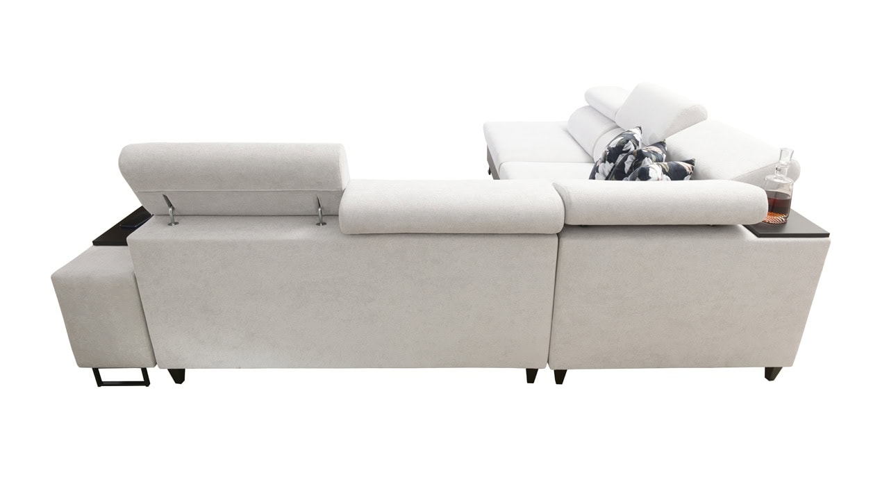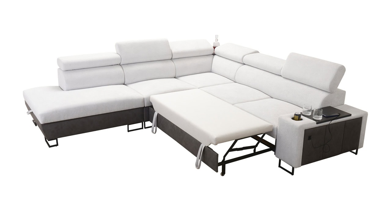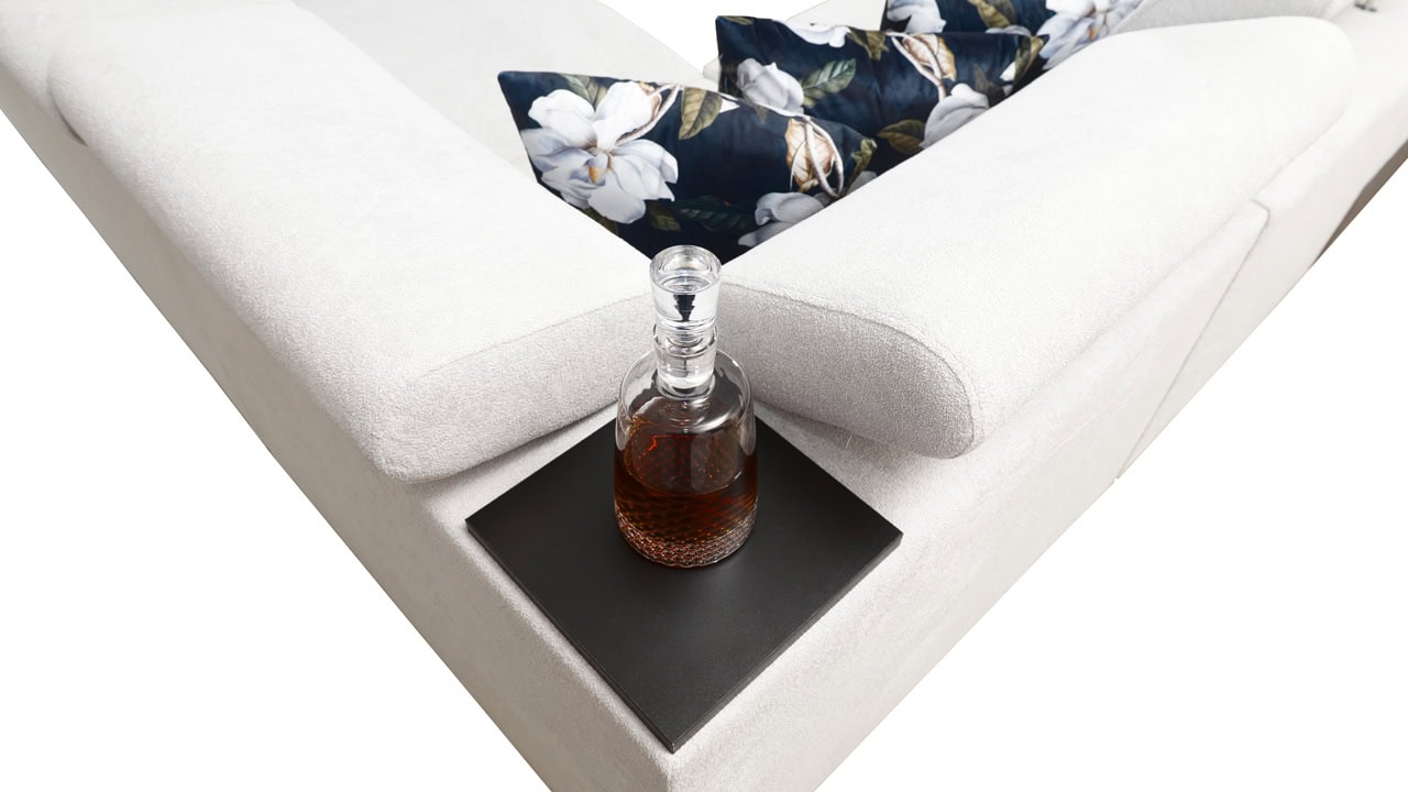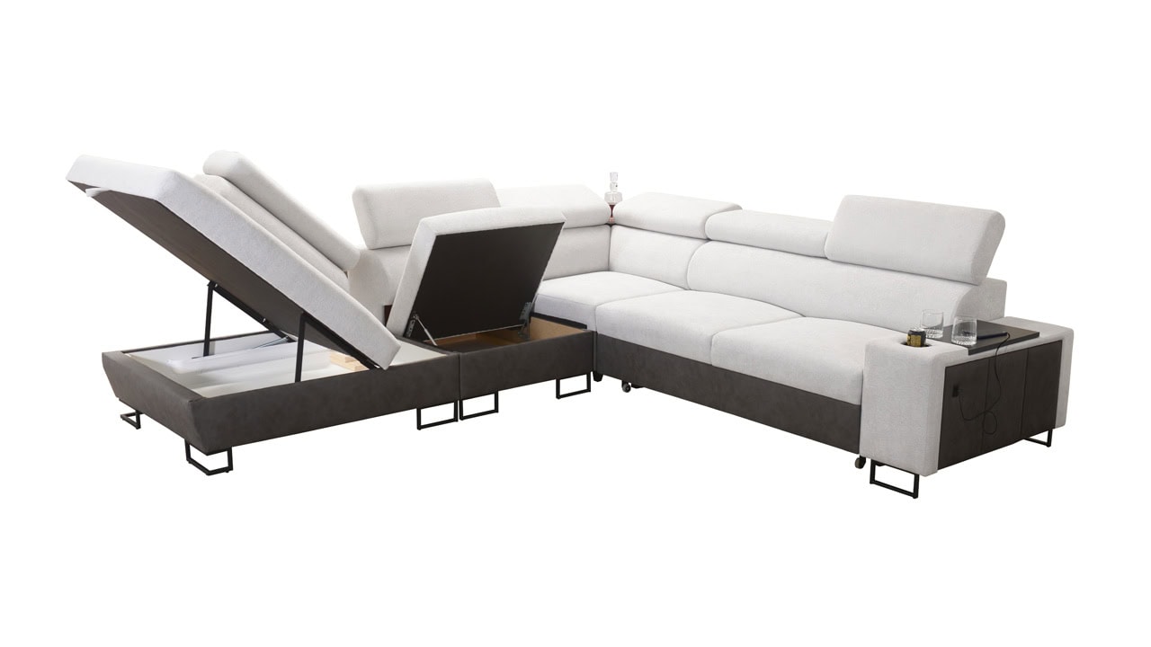 Nagy sarokkanapé a modern élethez. Mindennel fel van szerelve, ami egy kanapétól elvárható – ágyazható, nagy tárolóhellyel rendelkezik, állítható fejtámlákkal, beépített minibárral, pohártartóval, valamint beépített USB töltővel a mobiltelefon vagy tablet töltéséhez. Ezen kívül extra kényelmes, így tökéletes társ a hosszú estékhez egy film vagy egy jó könyv mellett.