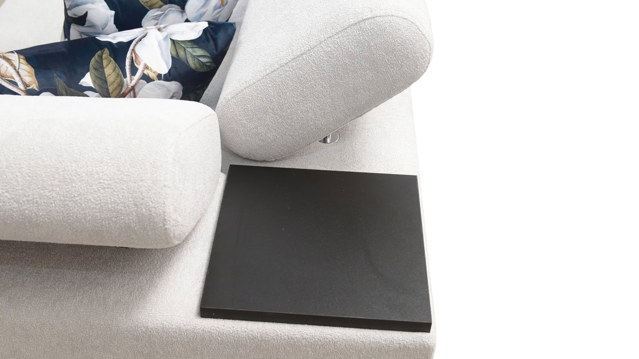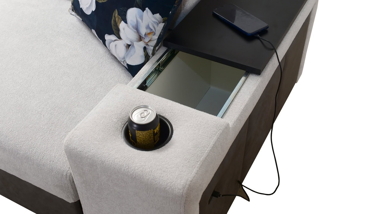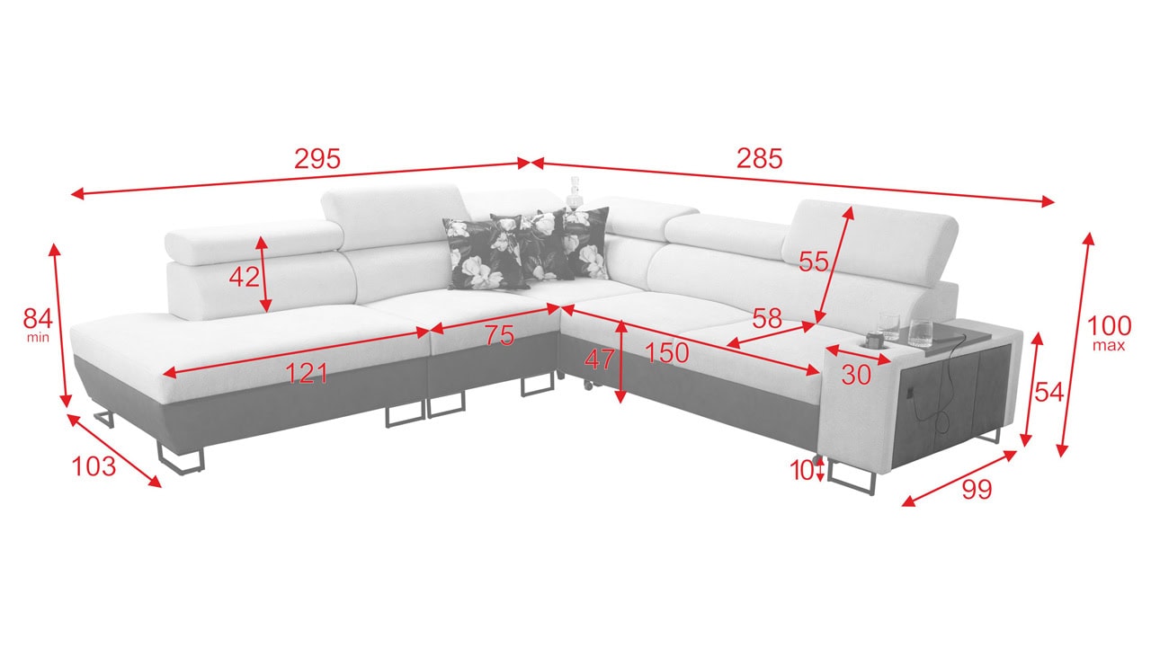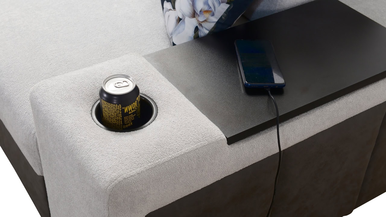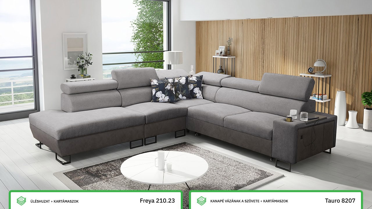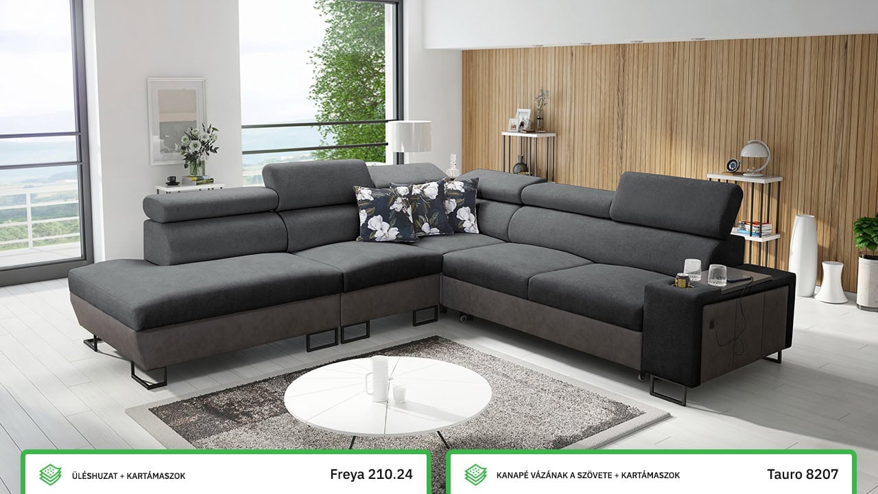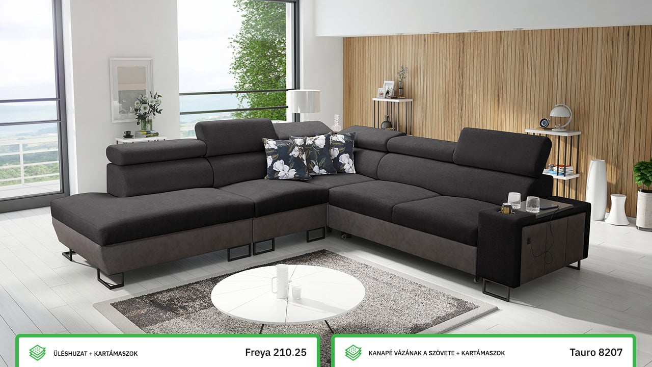 Nagy sarokkanapé a modern élethez. Mindennel fel van szerelve, ami egy kanapétól elvárható – ágyazható, nagy tárolóhellyel rendelkezik, állítható fejtámlákkal, beépített minibárral, pohártartóval, valamint beépített USB töltővel a mobiltelefon vagy tablet töltéséhez. Ezen kívül extra kényelmes, így tökéletes társ a hosszú estékhez egy film vagy egy jó könyv mellett.