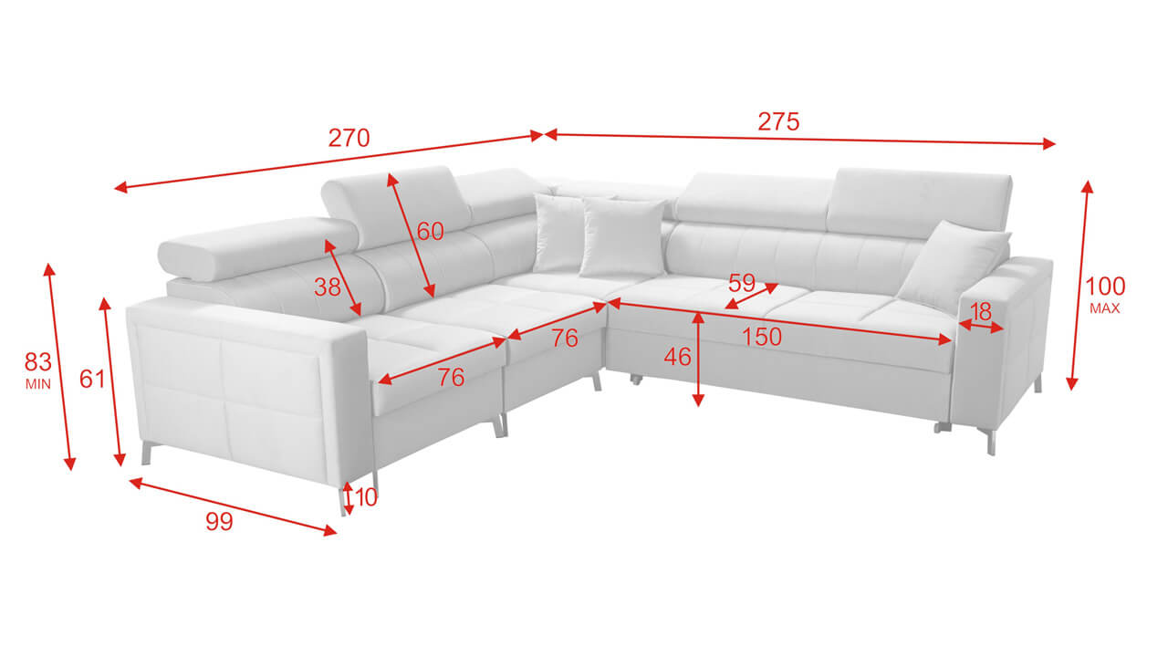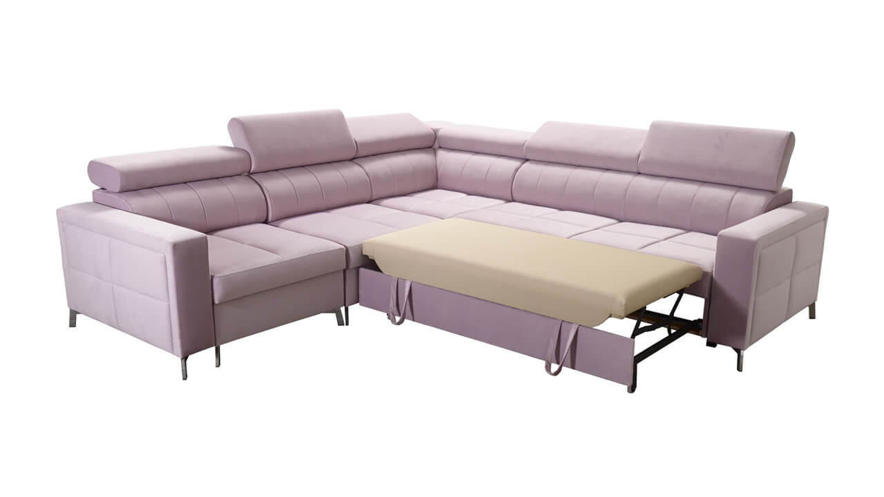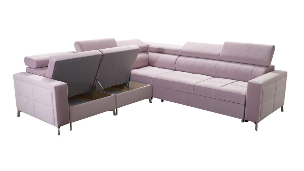 Modern, kényelmes és minőségi sarokkanapé, amely méreteinek köszönhetően kisebb lakásokba is alkalmas. Beépített állítható fejtámlákkal, tárolóhellyel is rendelkezik, valamint kihajtható. További előnye, hogy a kanapét tetszés szerint kombinálhatja a huzat típusát és színét. Könnyen összeillesztheti régebbi bútorokkal. Vessen egy pillantást a vizualizációkra és merítsen ihletet terveinkből.